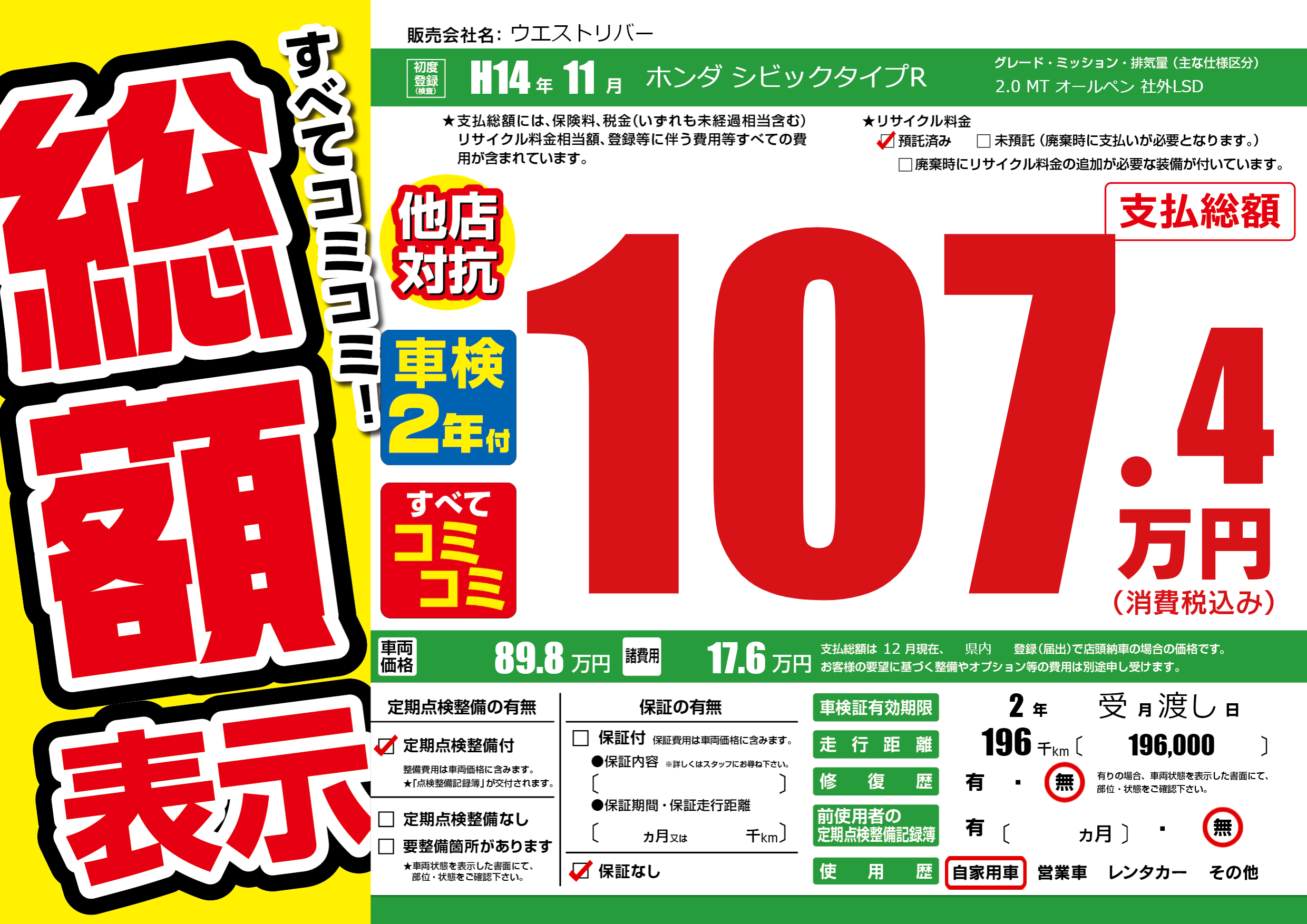| 車名 | ホンダ シビックタイプR | グレード ミッション 排気量 |