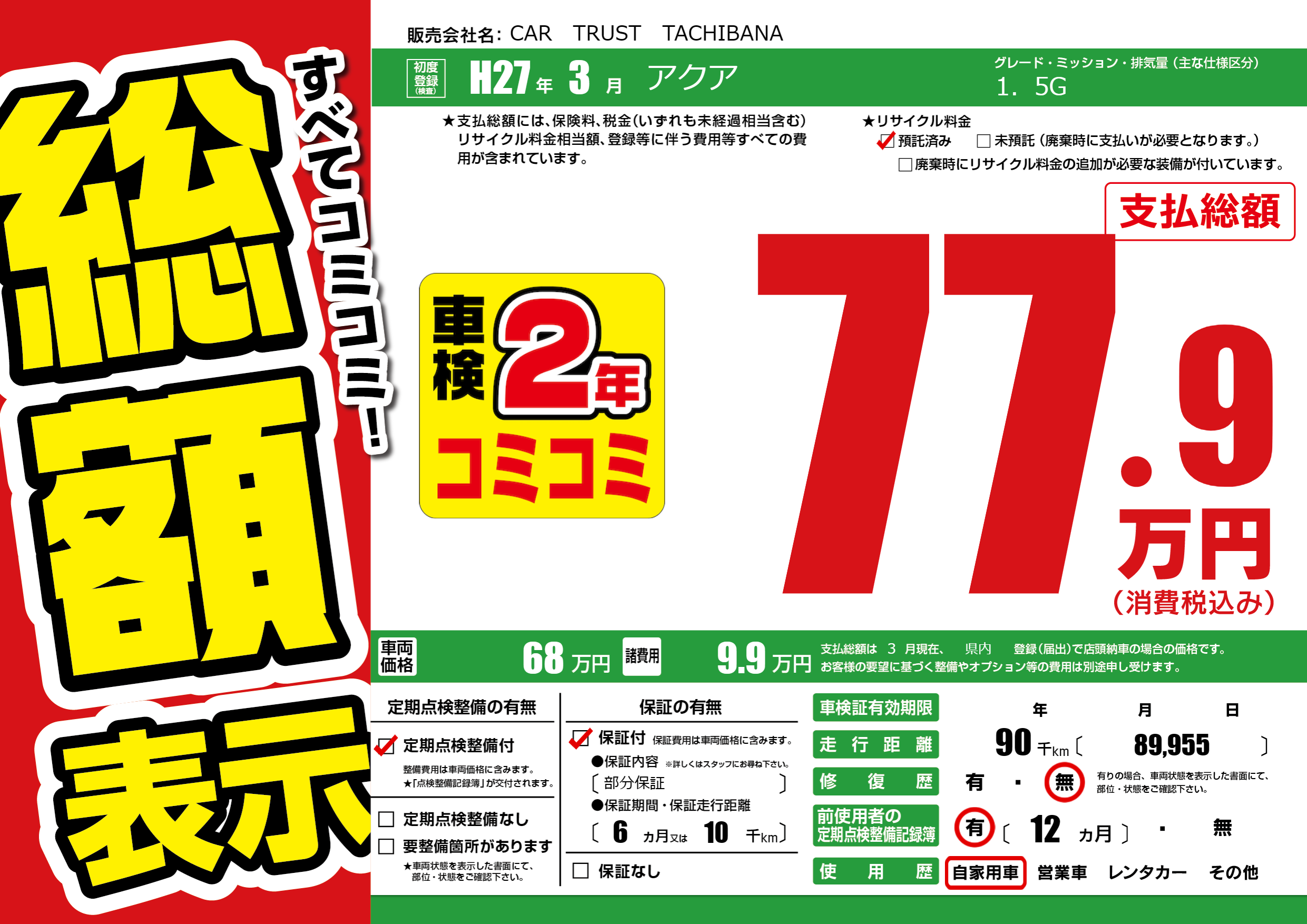 | 走行キロ | 9万km | 初年度登録 | H27年3月 |
