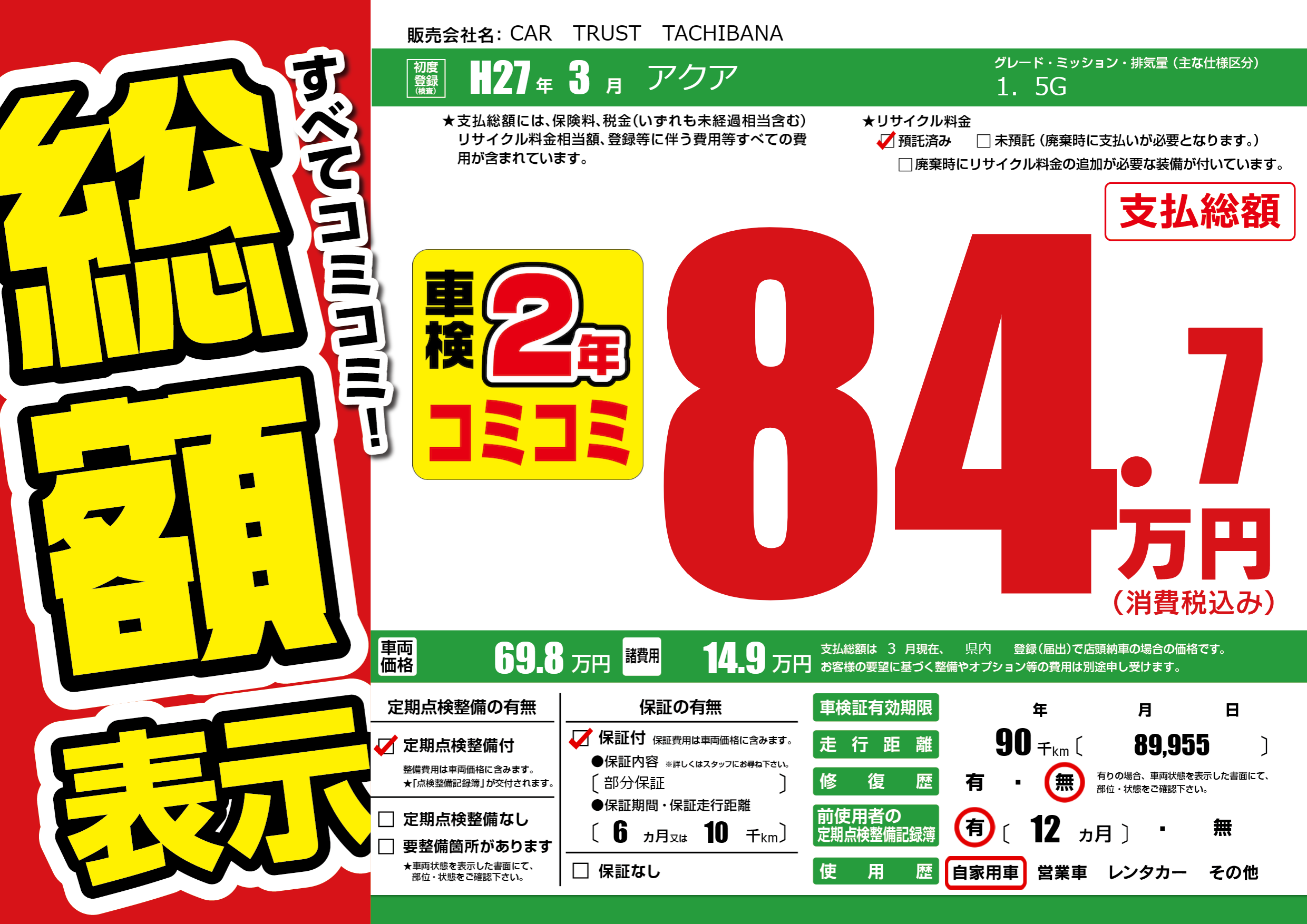| 走行キロ | 9万km | 初年度登録 | H27年3月 |