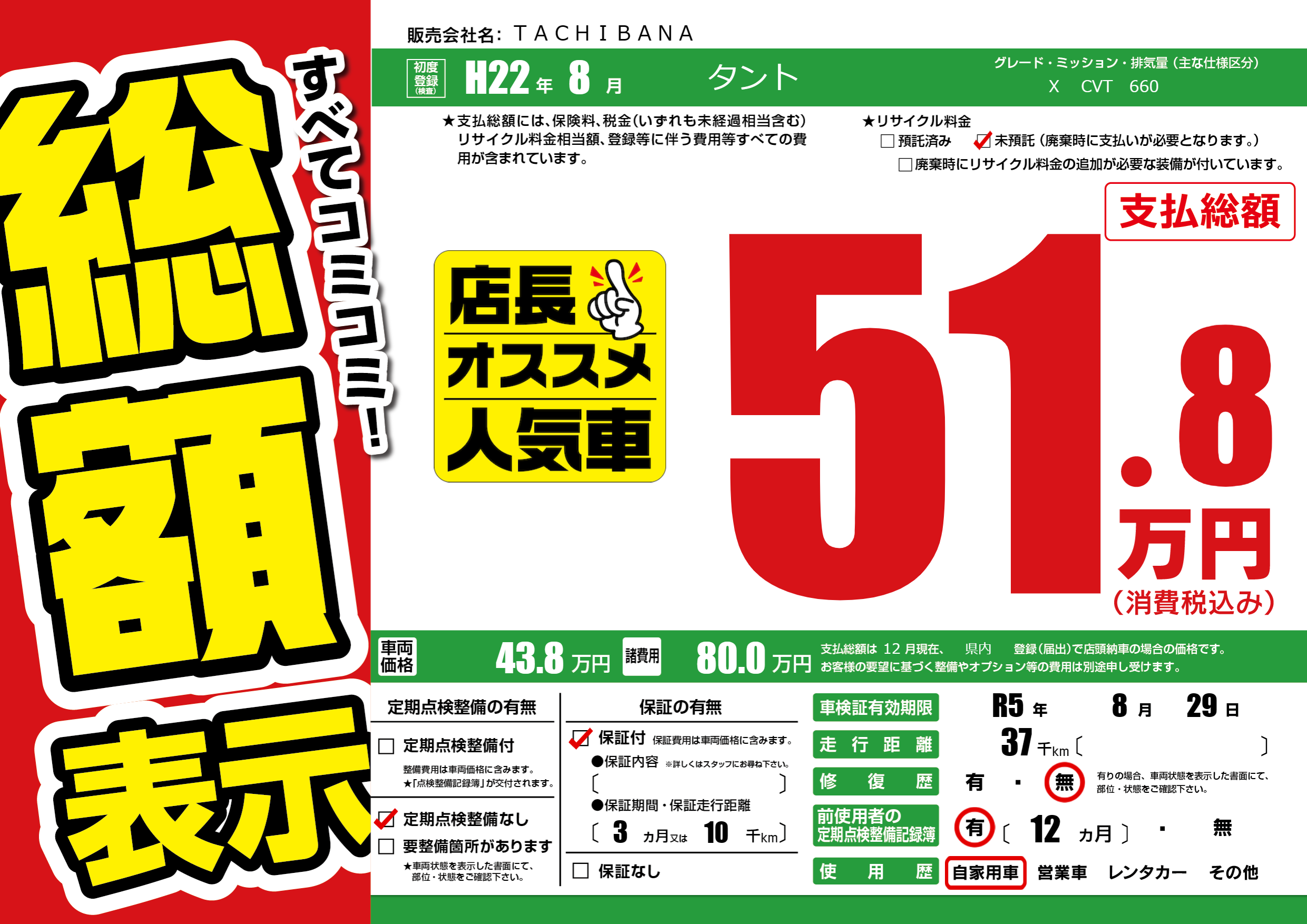| 走行キロ | 3.7万km | 初年度登録 | H22年8月 |