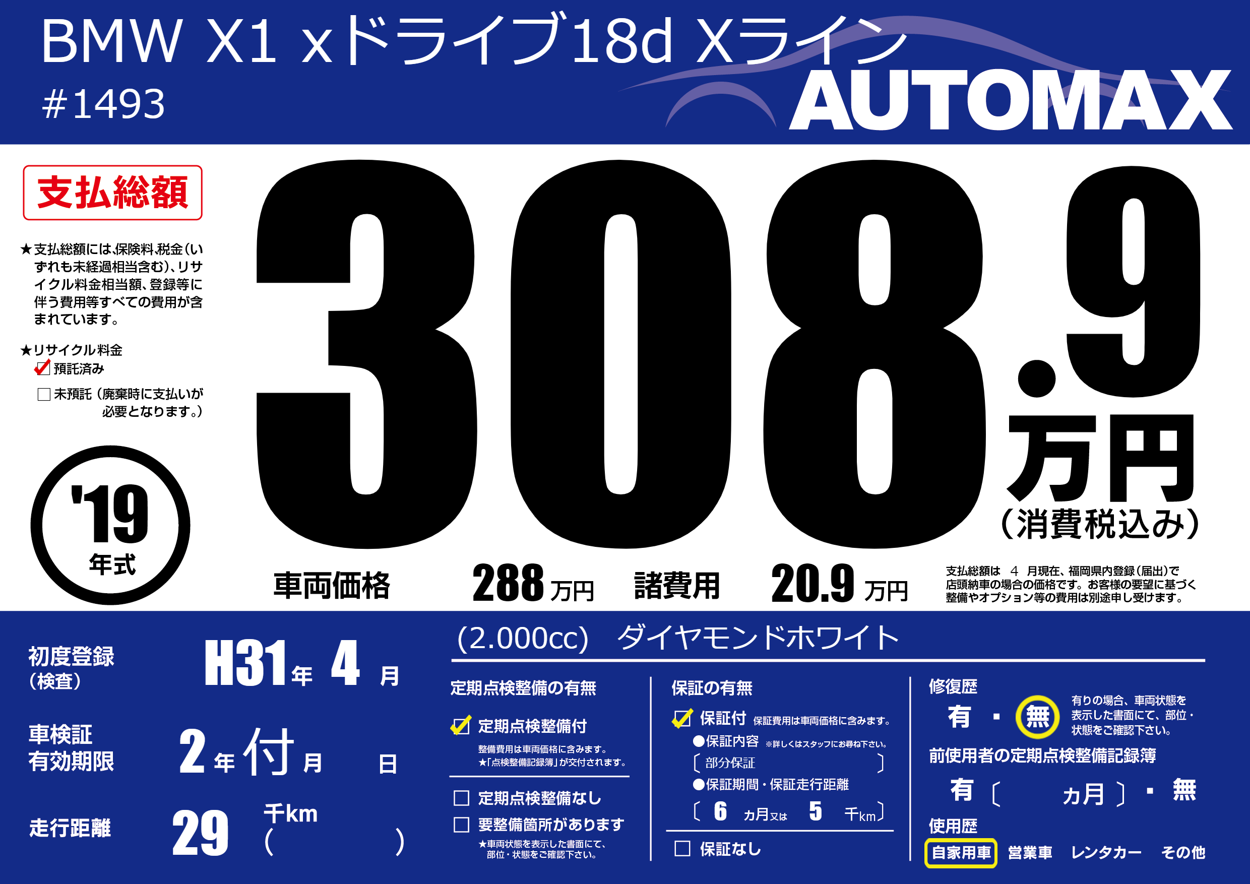 | 車名 | BMW X1 xドライブ18d Xライン | グレード ミッション 排気量 |