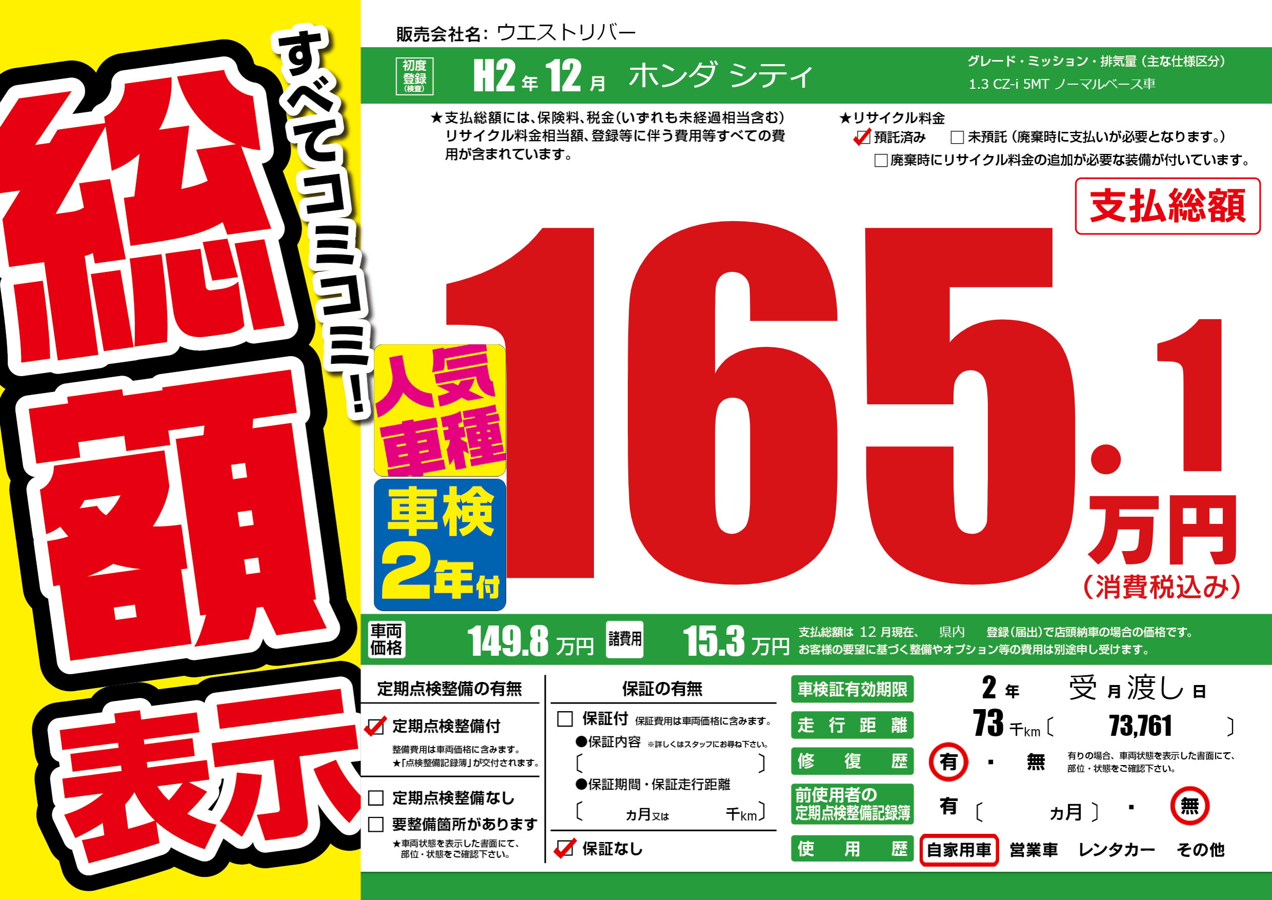 | 車名 | ホンダ シティ | グレード ミッション 排気量 |