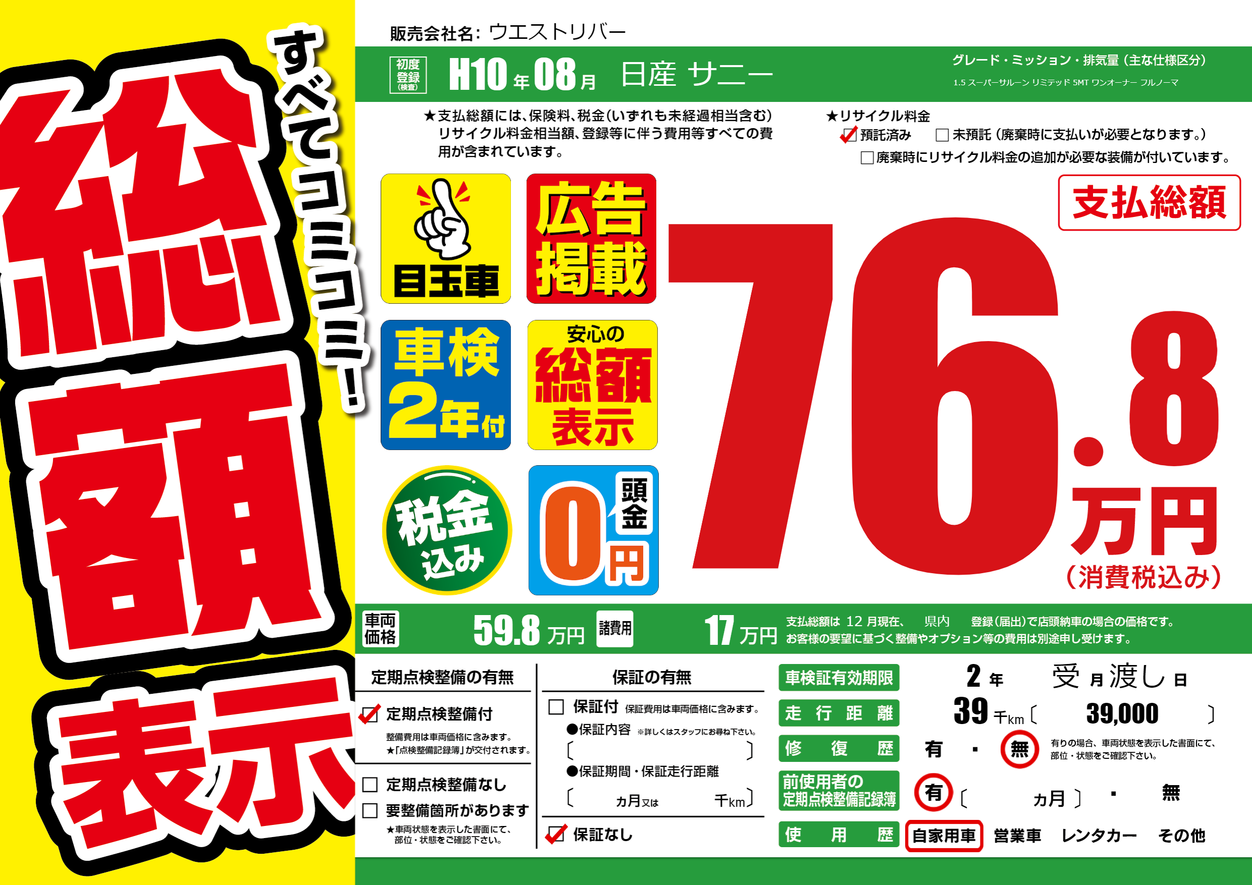 | 車名 | 日産 サニー | グレード ミッション 排気量 |