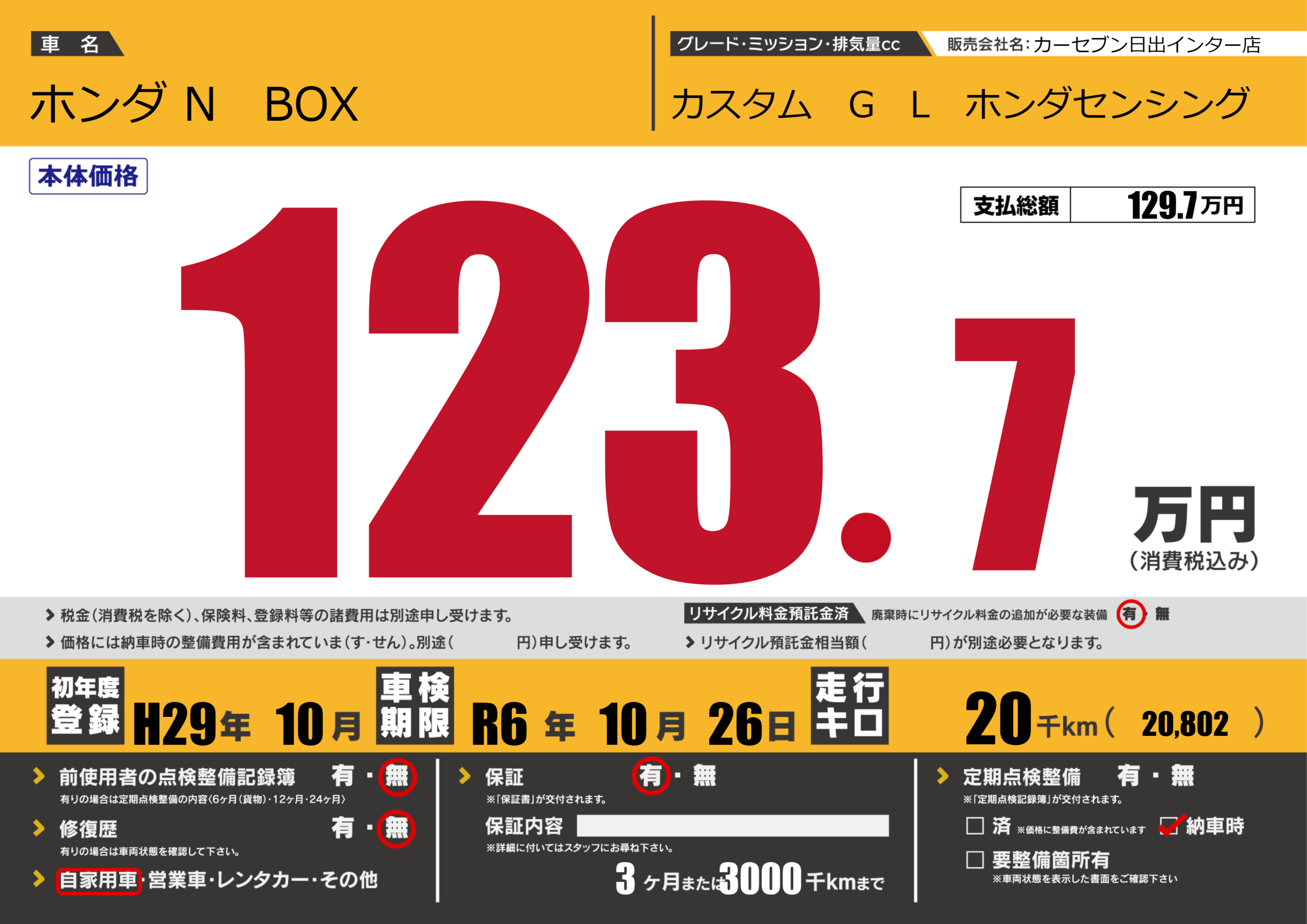 | 走行キロ | 2万km | 初年度登録 | H29年10月 |