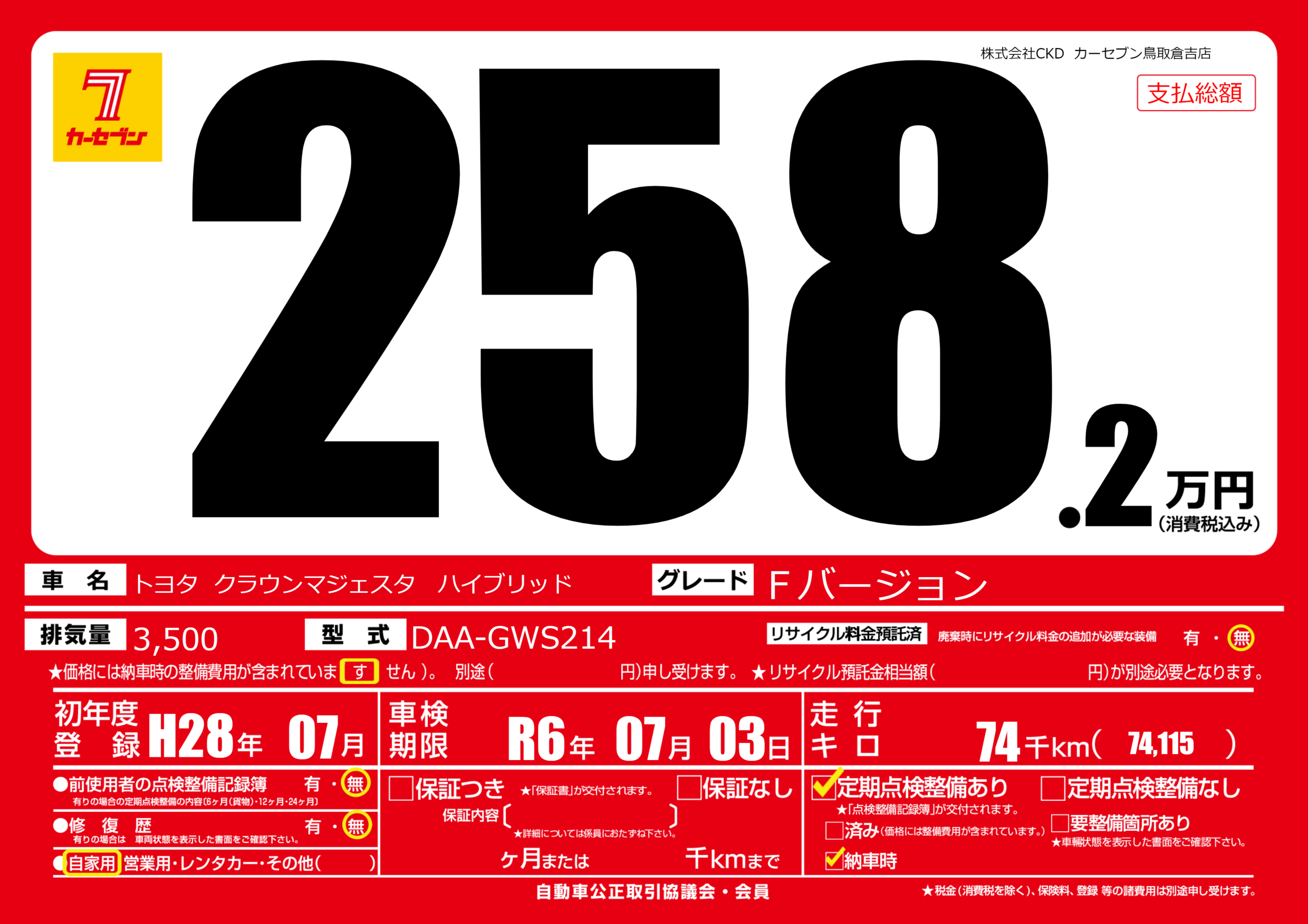 | 車名 | トヨタ クラウンマジェスタ ハイブリッド | グレード ミッション 排気量 |