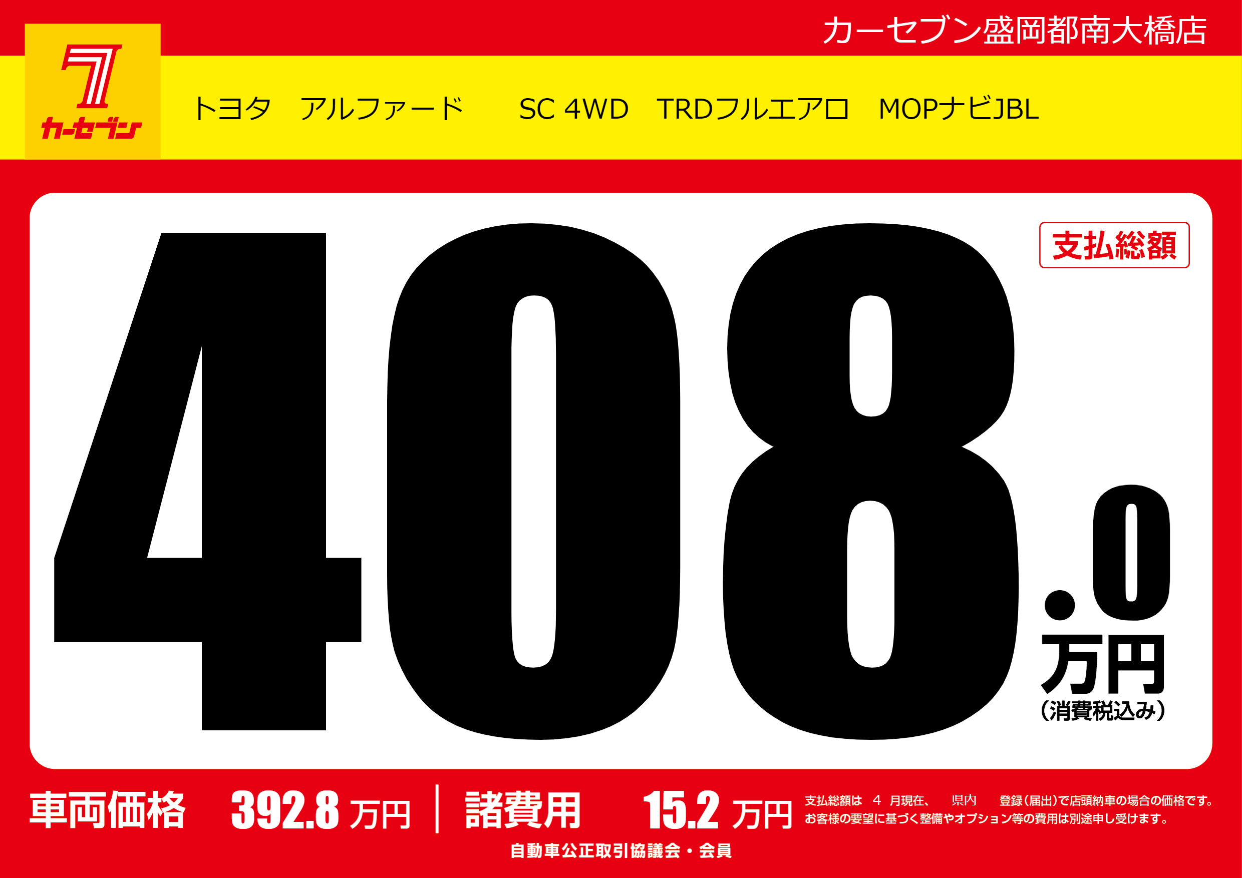 | 車名 | トヨタ アルファード SC 4WD TRDフルエアロ MOPナビJBL | グレード ミッション 排気量 |