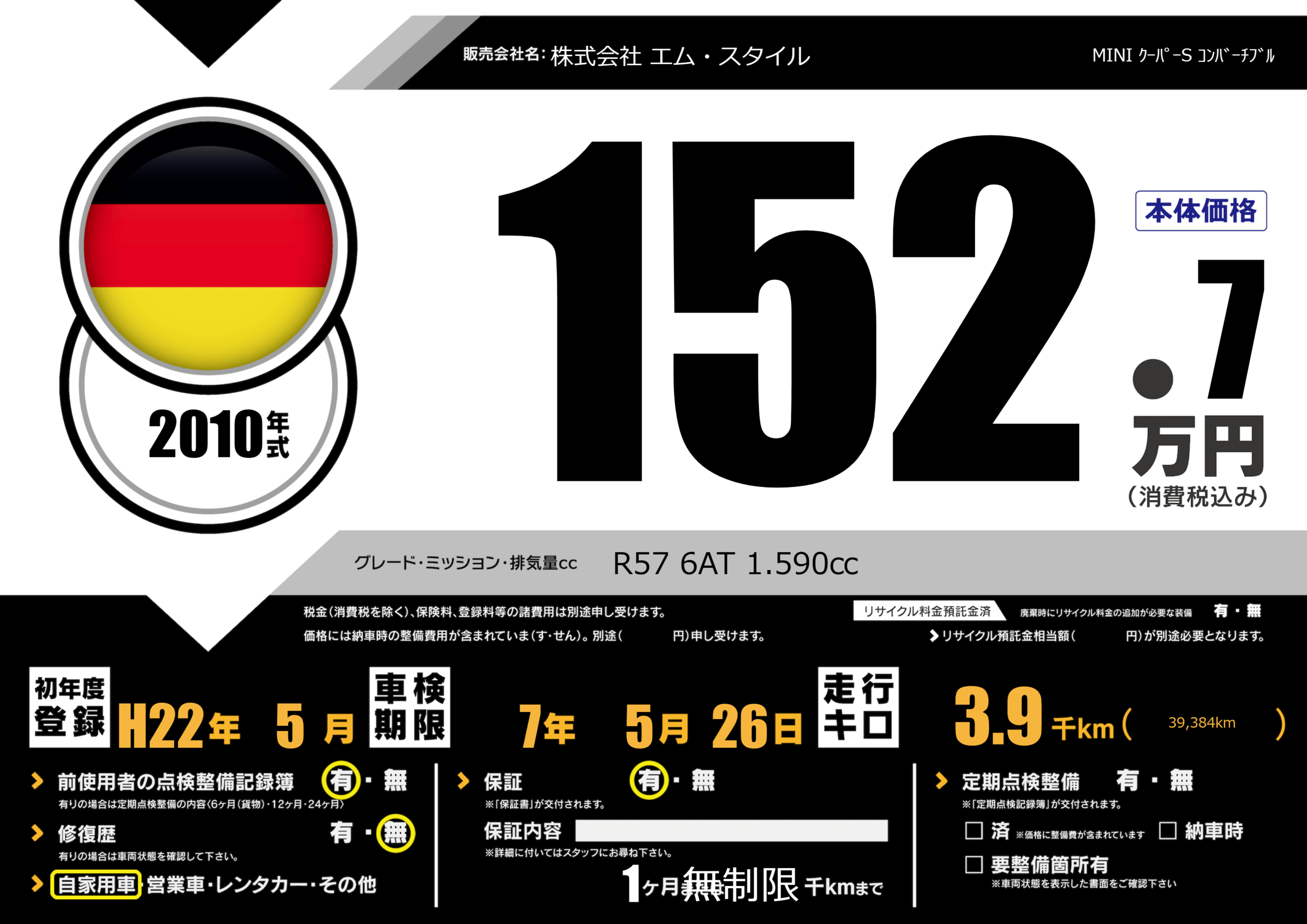 | 車名 | MINI クーパーS コンバーチブル | グレード ミッション 排気量 |