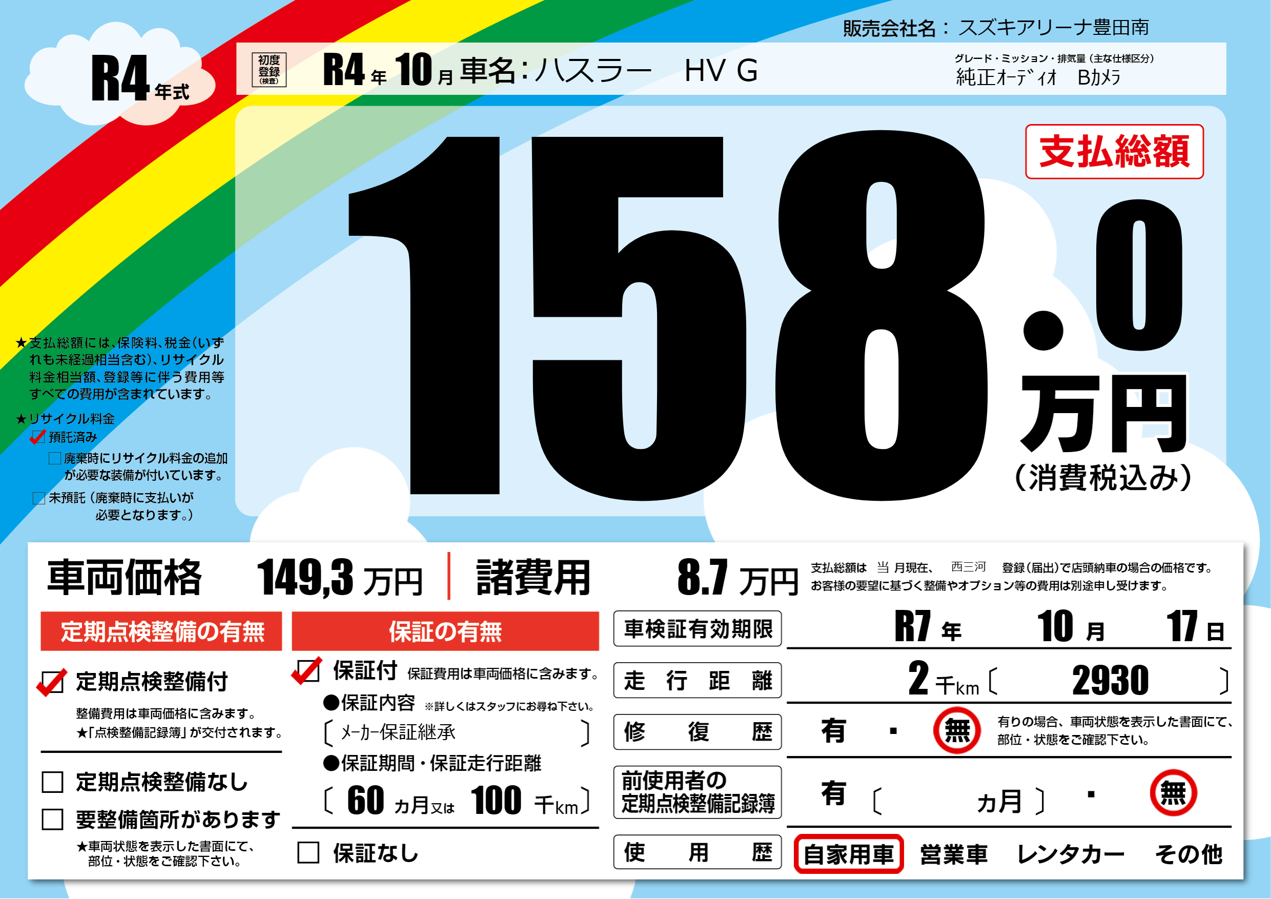 | 車名 | ハスラー HV G | グレード ミッション 排気量 |