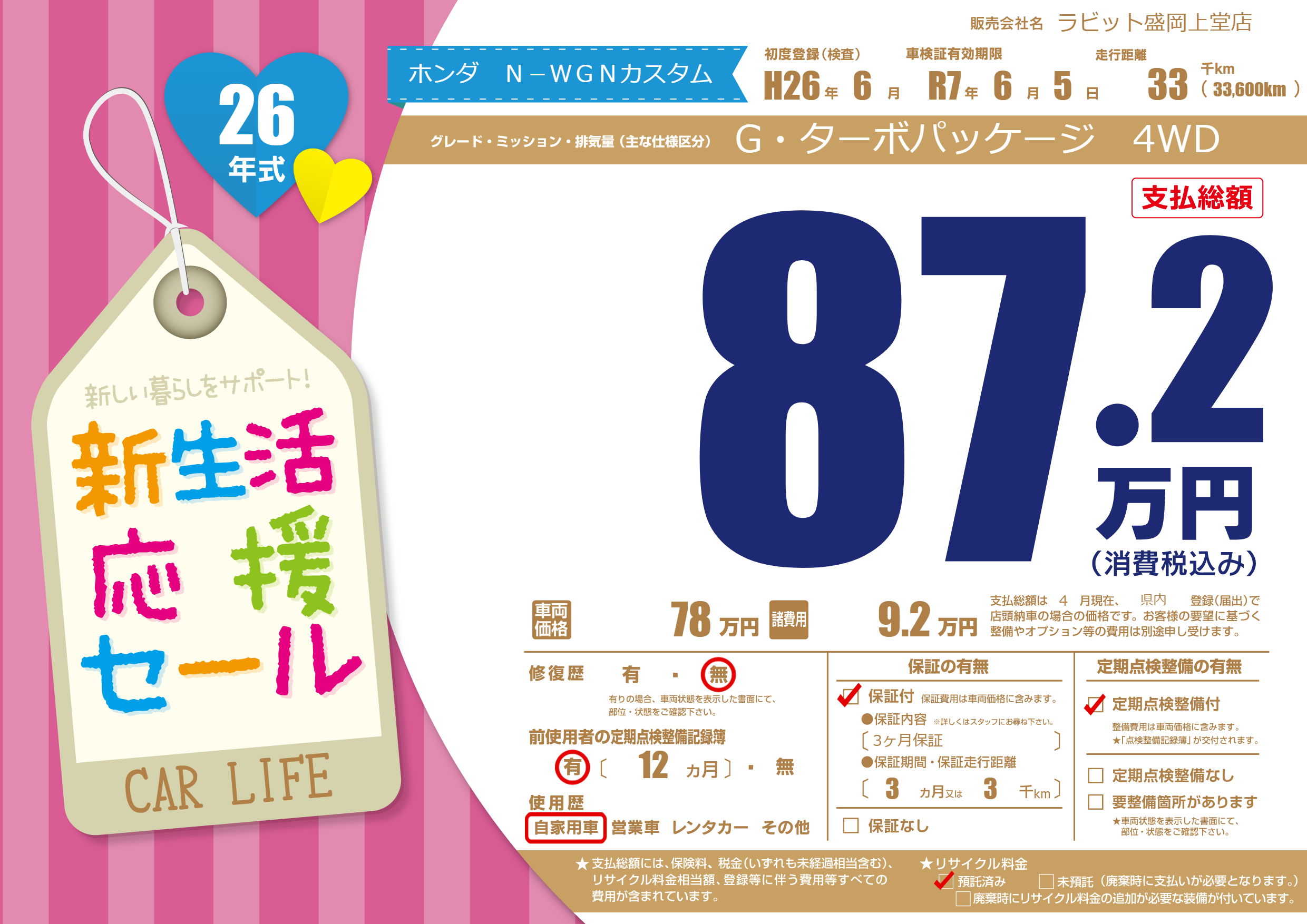 | 走行キロ | 3.3万km | 初年度登録 | H26年6月 |