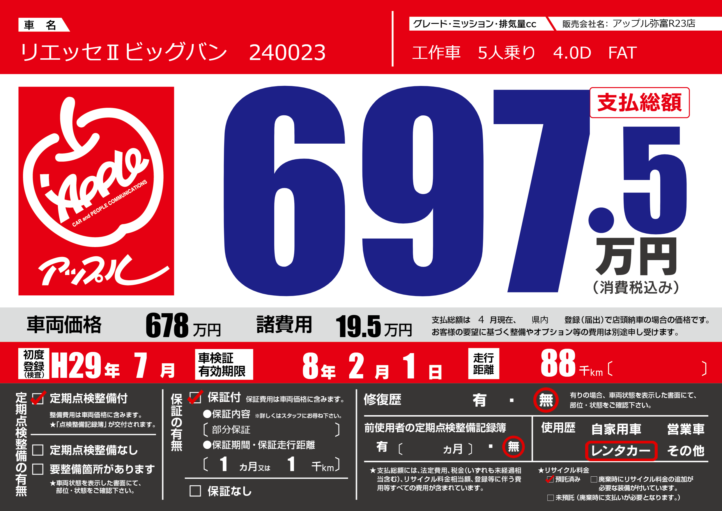 | 車名 | リエッセⅡビッグバン 240023 | グレード ミッション 排気量 |
