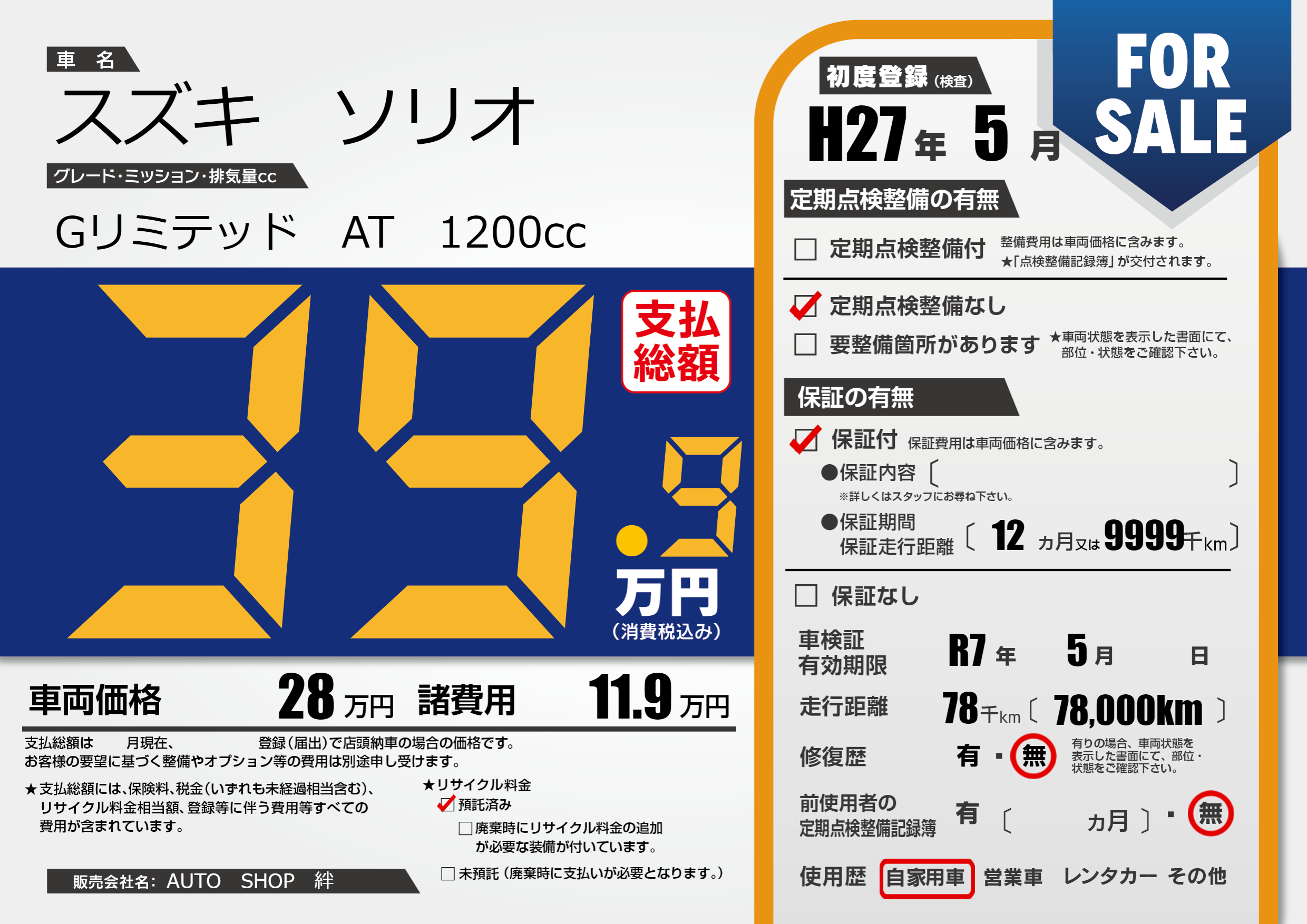 | 車名 | スズキ ソリオ | グレード ミッション 排気量 |