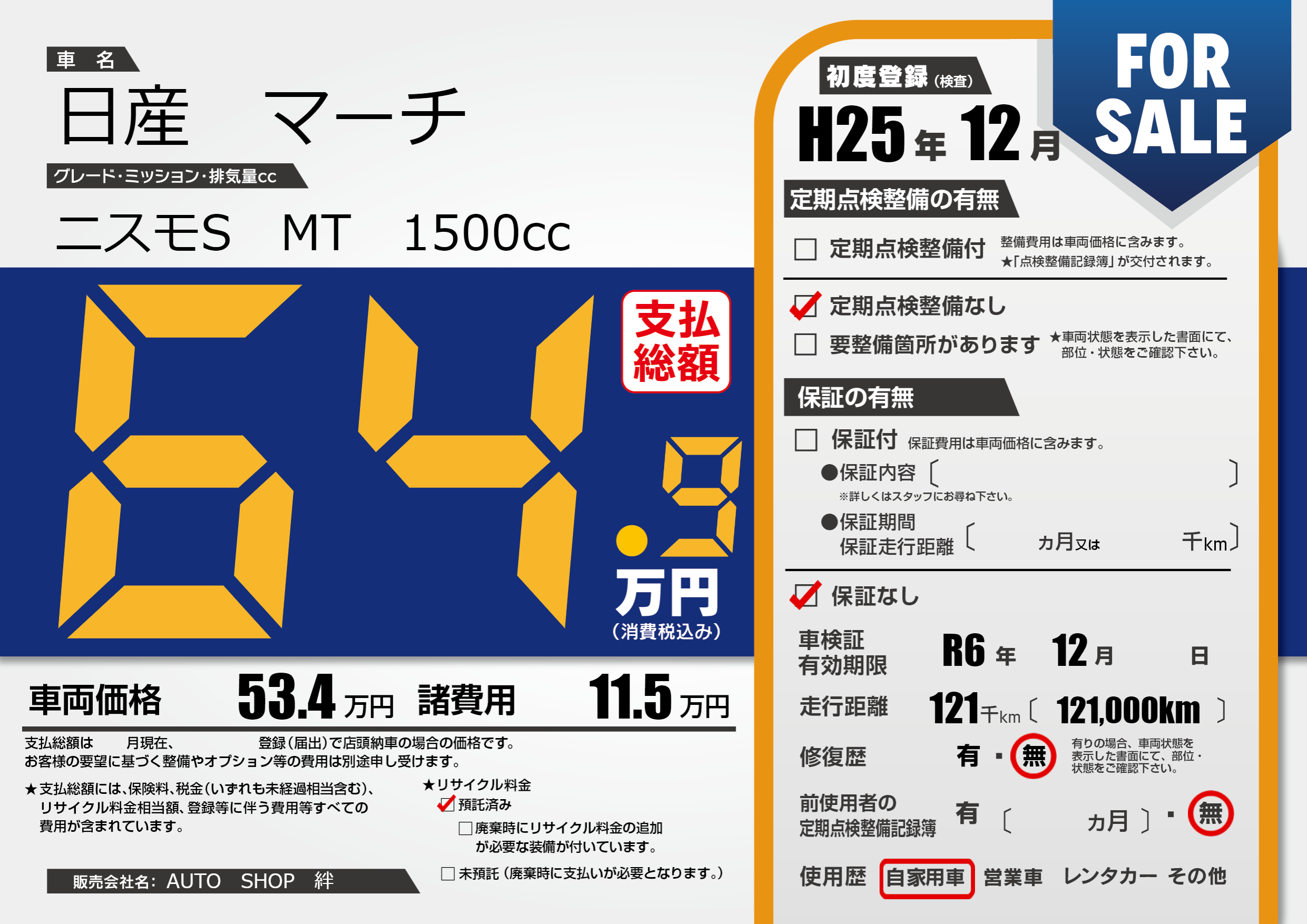 | 車名 | 日産 マーチ | グレード ミッション 排気量 |
