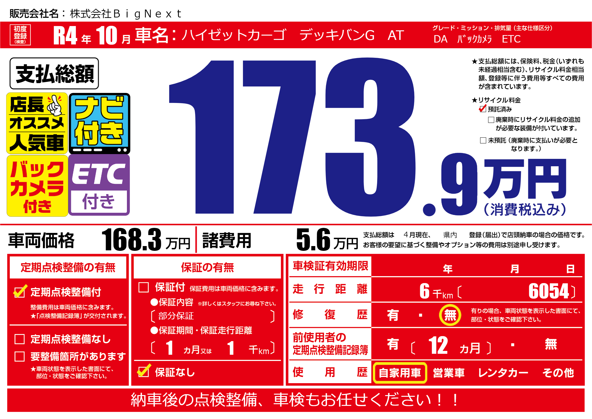 | 車名 | ハイゼットカーゴ デッキバンG AT | グレード ミッション 排気量 |