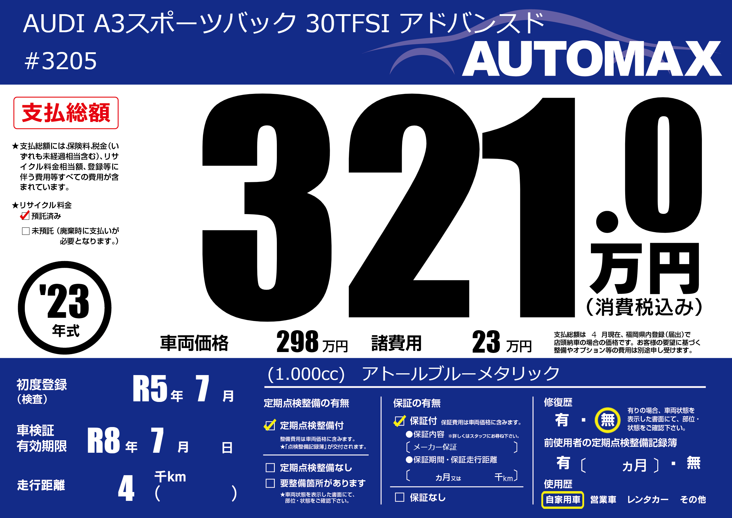 | 車名 | AUDI A3スポーツバック 30TFSI アドバンスド | グレード ミッション 排気量 |