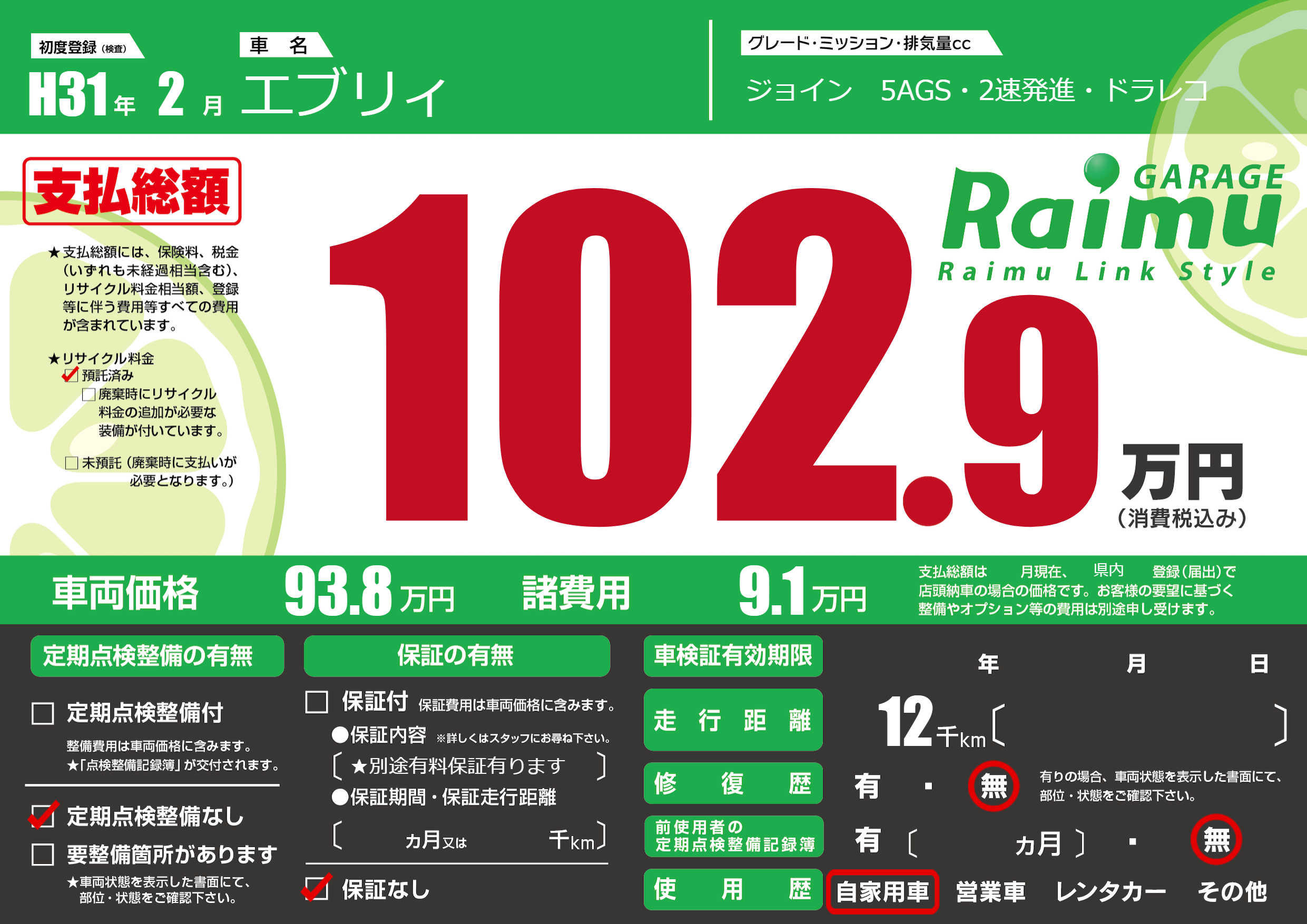 | 車名 | エブリィ | グレード ミッション 排気量 |