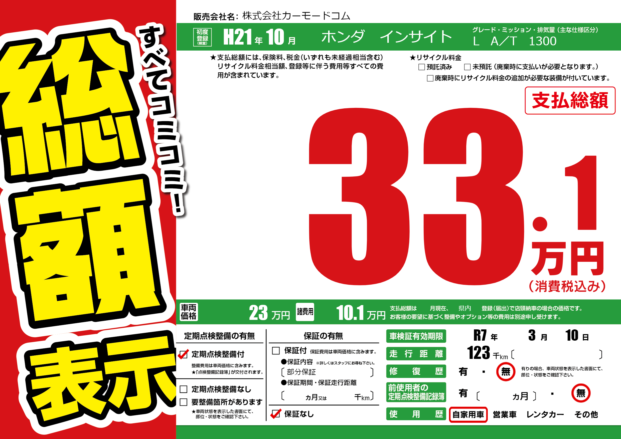 | 車名 | ホンダ インサイト | グレード ミッション 排気量 |