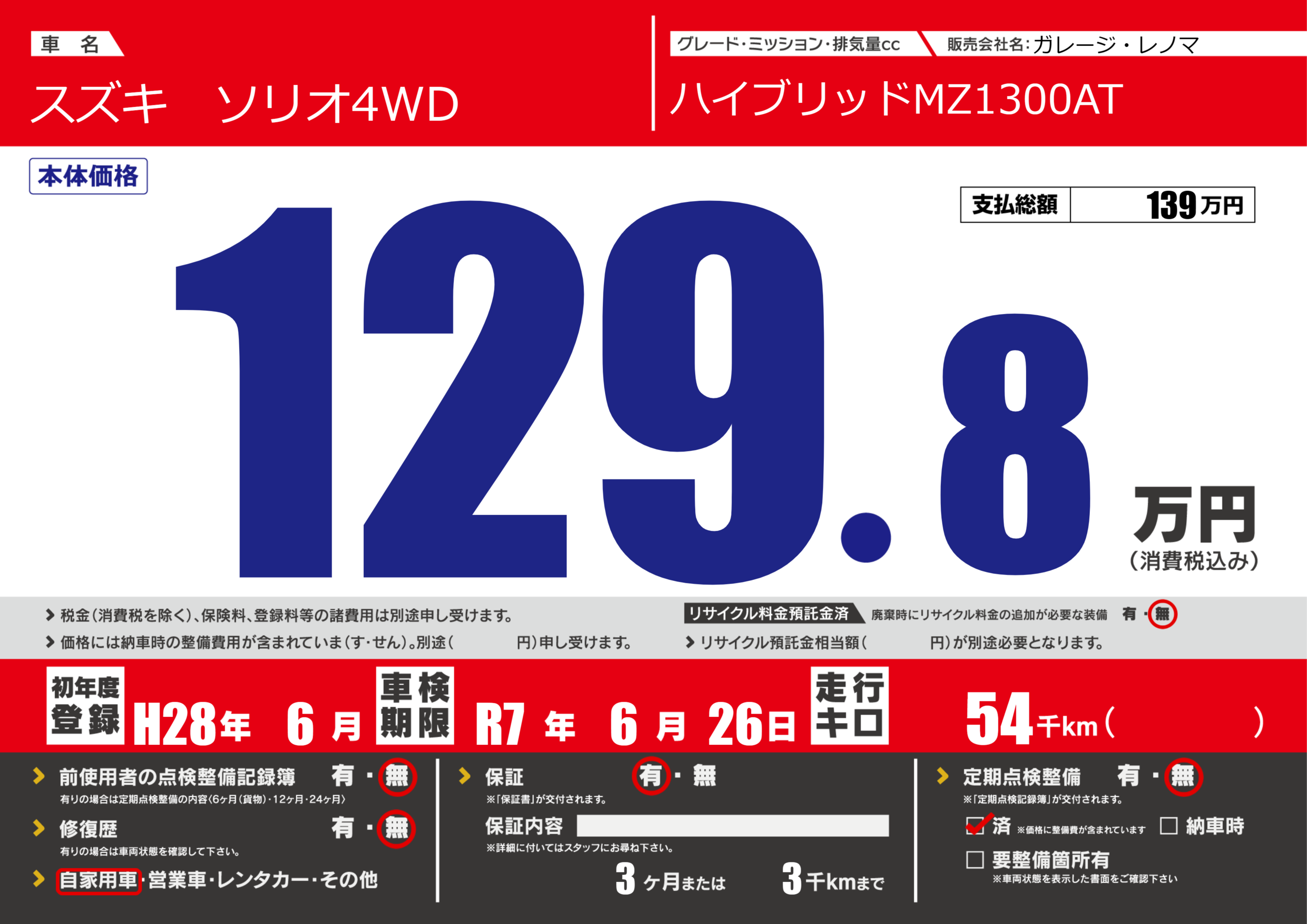 なし | 車検制限 | R7年6月26月 |