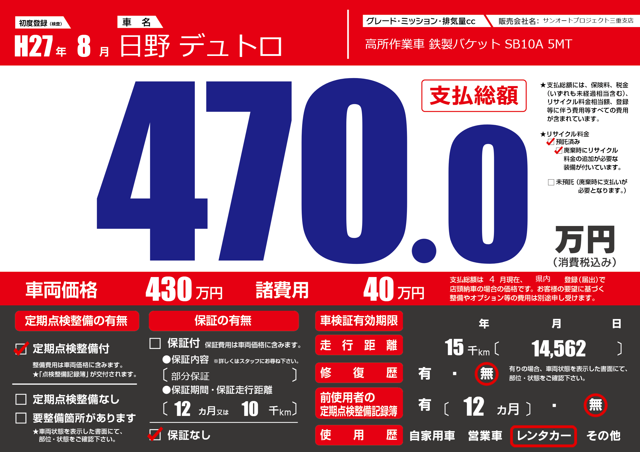 | 車名 | 日野 デュトロ | グレード ミッション 排気量 |