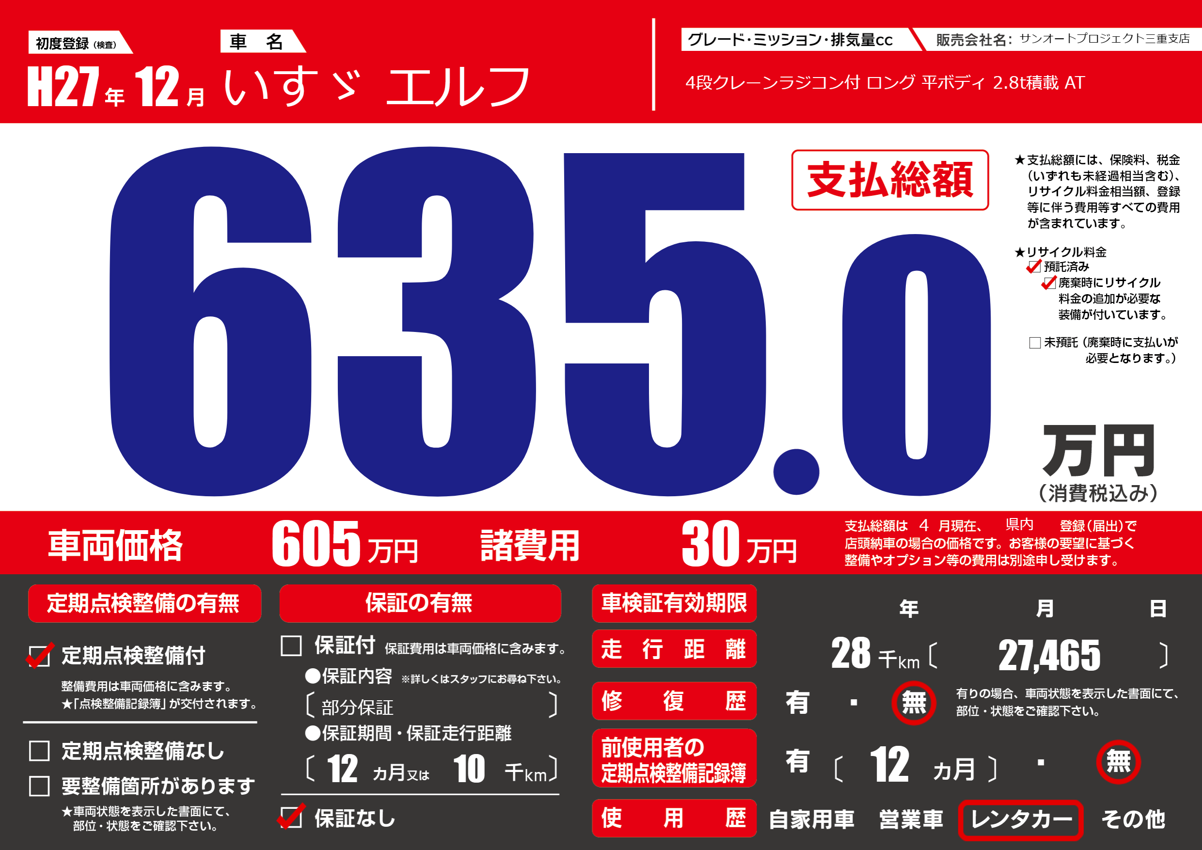 | 車名 | いすゞ エルフ | グレード ミッション 排気量 |
