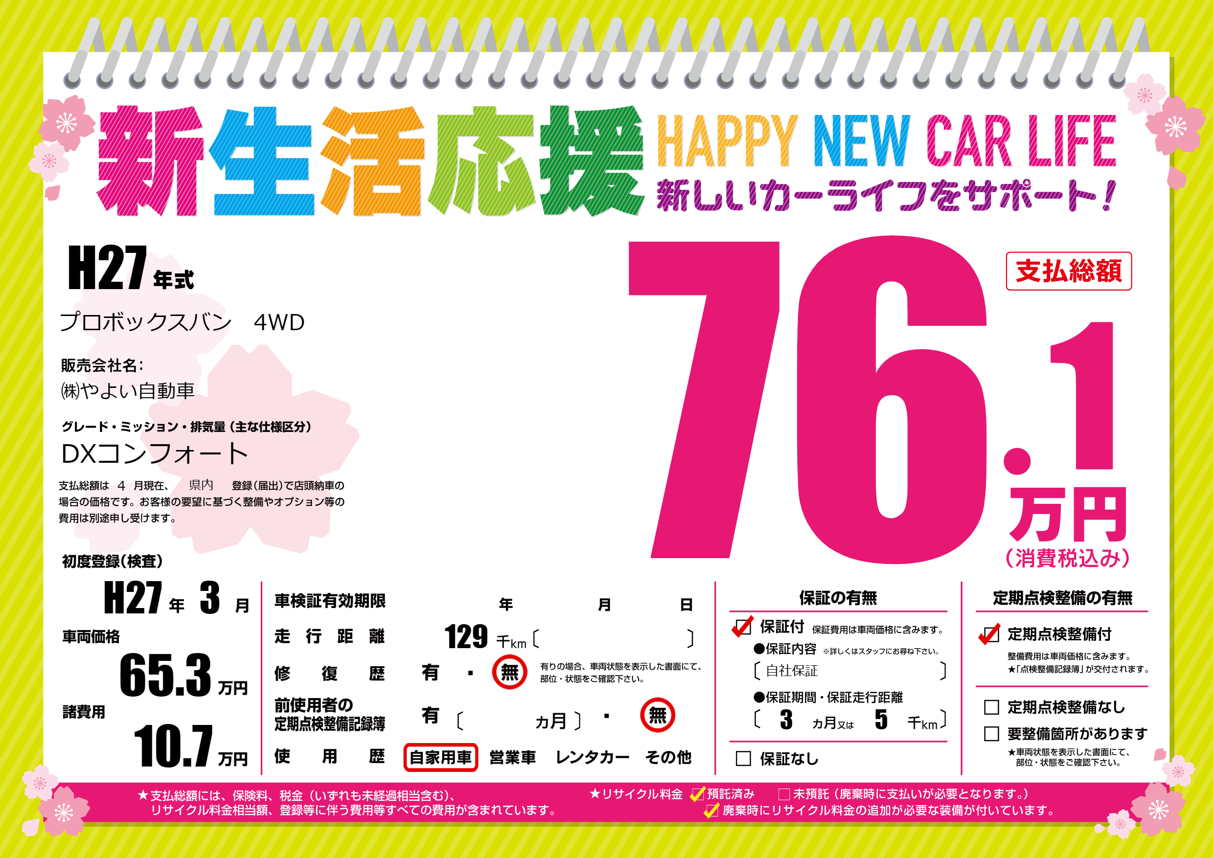 | 車名 | プロボックスバン 4WD | グレード ミッション 排気量 |