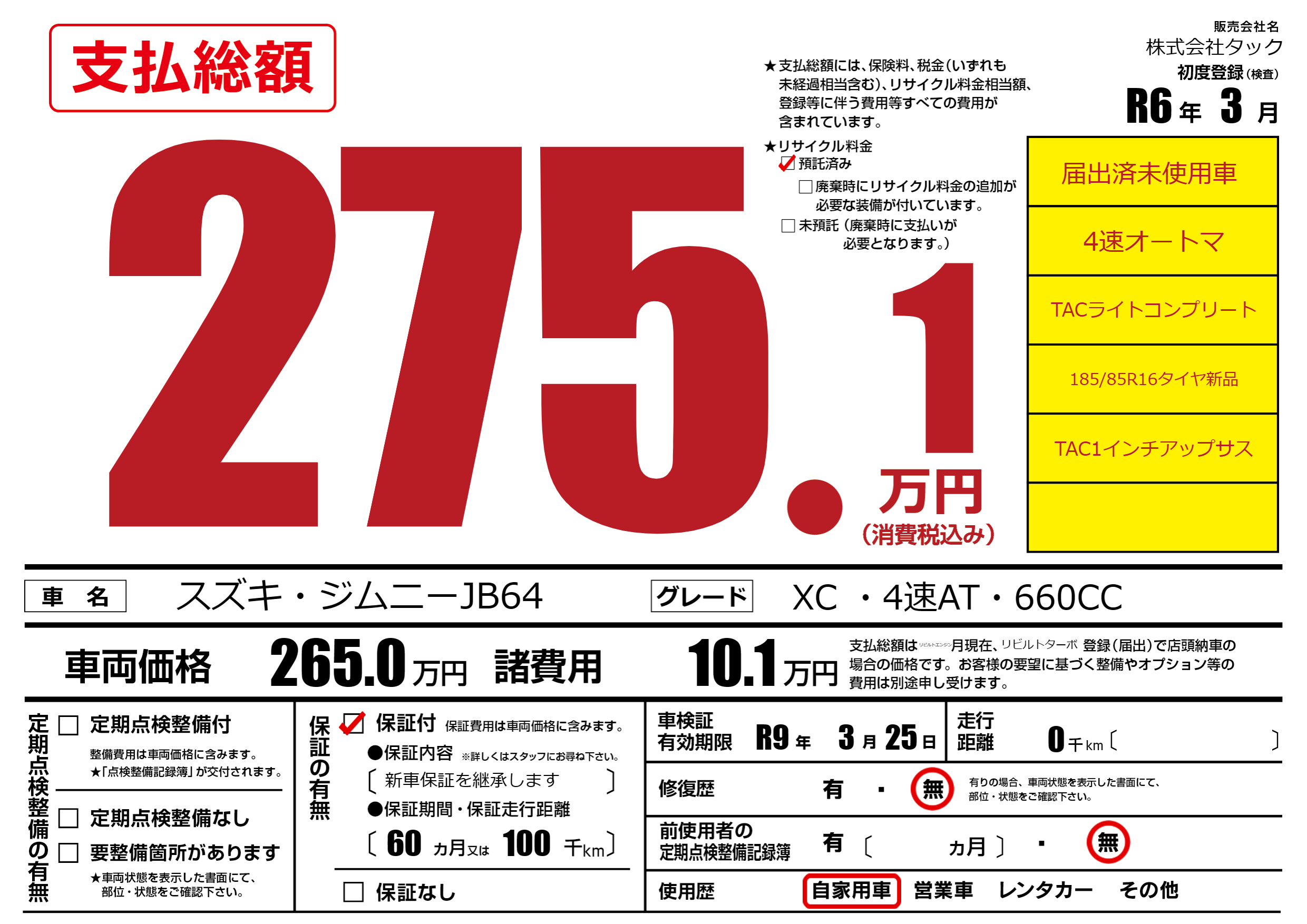 | 車名 | スズキ・ジムニーJB64 | グレード ミッション 排気量 |