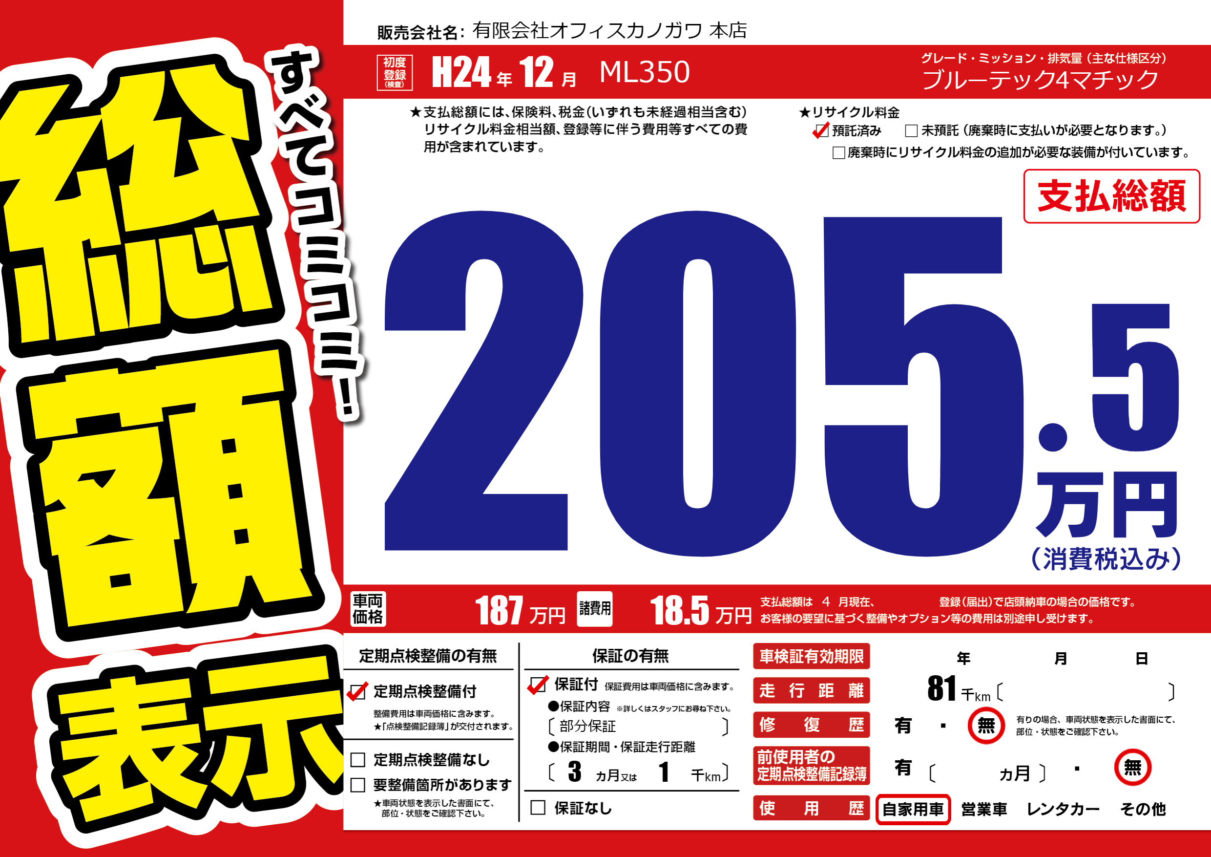 | 車名 | ML350 | グレード ミッション 排気量 |