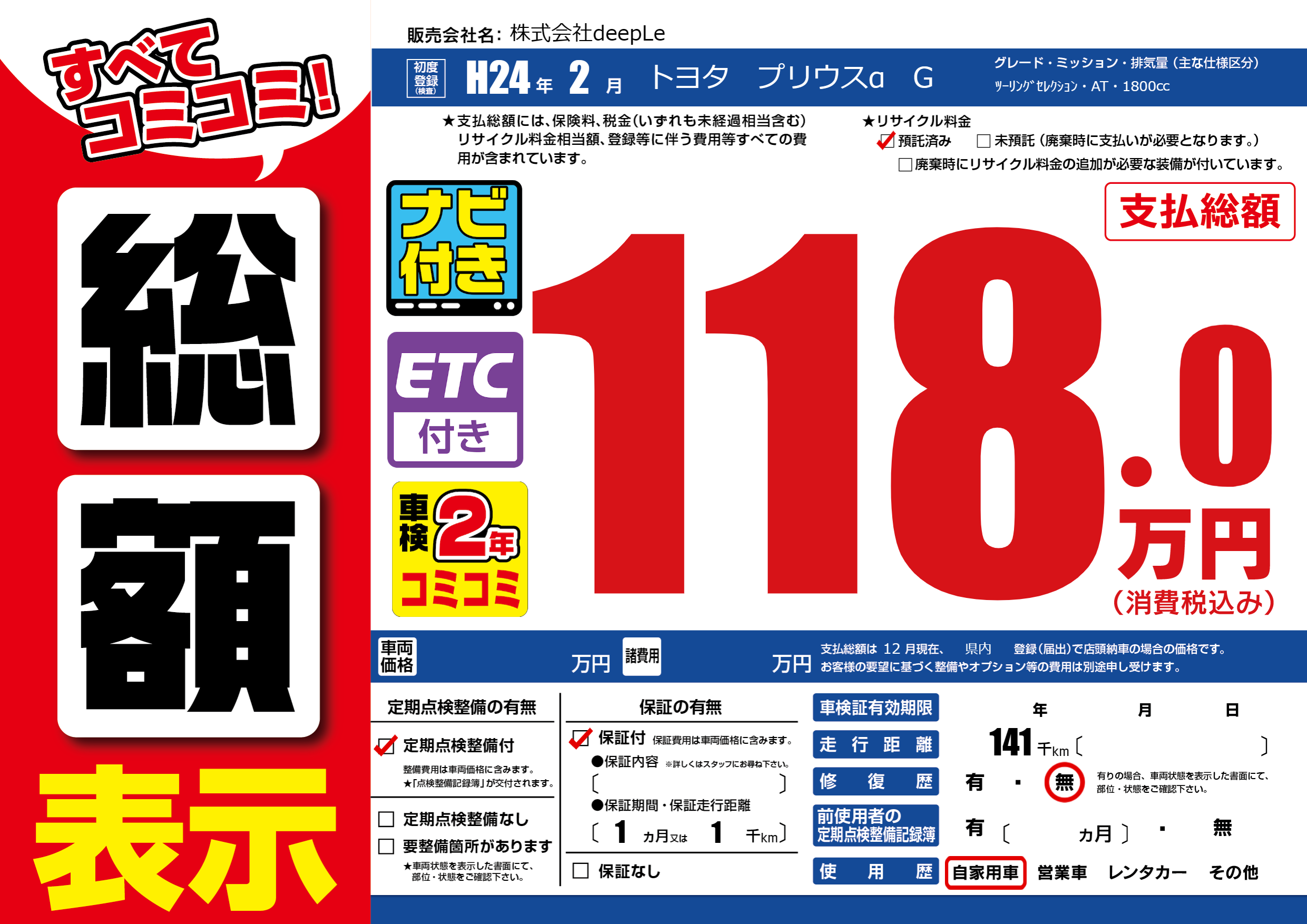| 走行キロ | 14.1万km | 初年度登録 | H24年2月 |