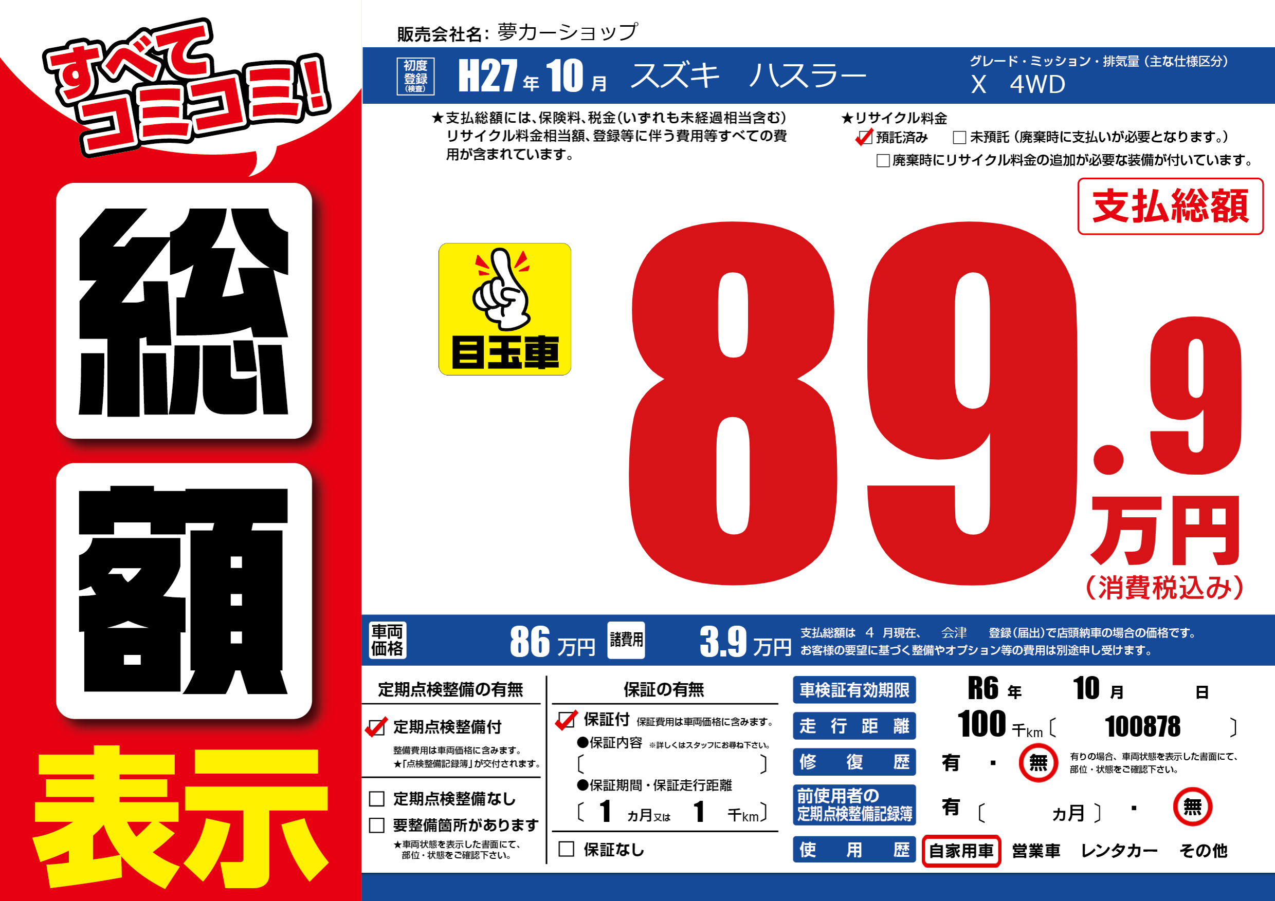 | 走行キロ | 10万km | 初年度登録 | H27年10月 |