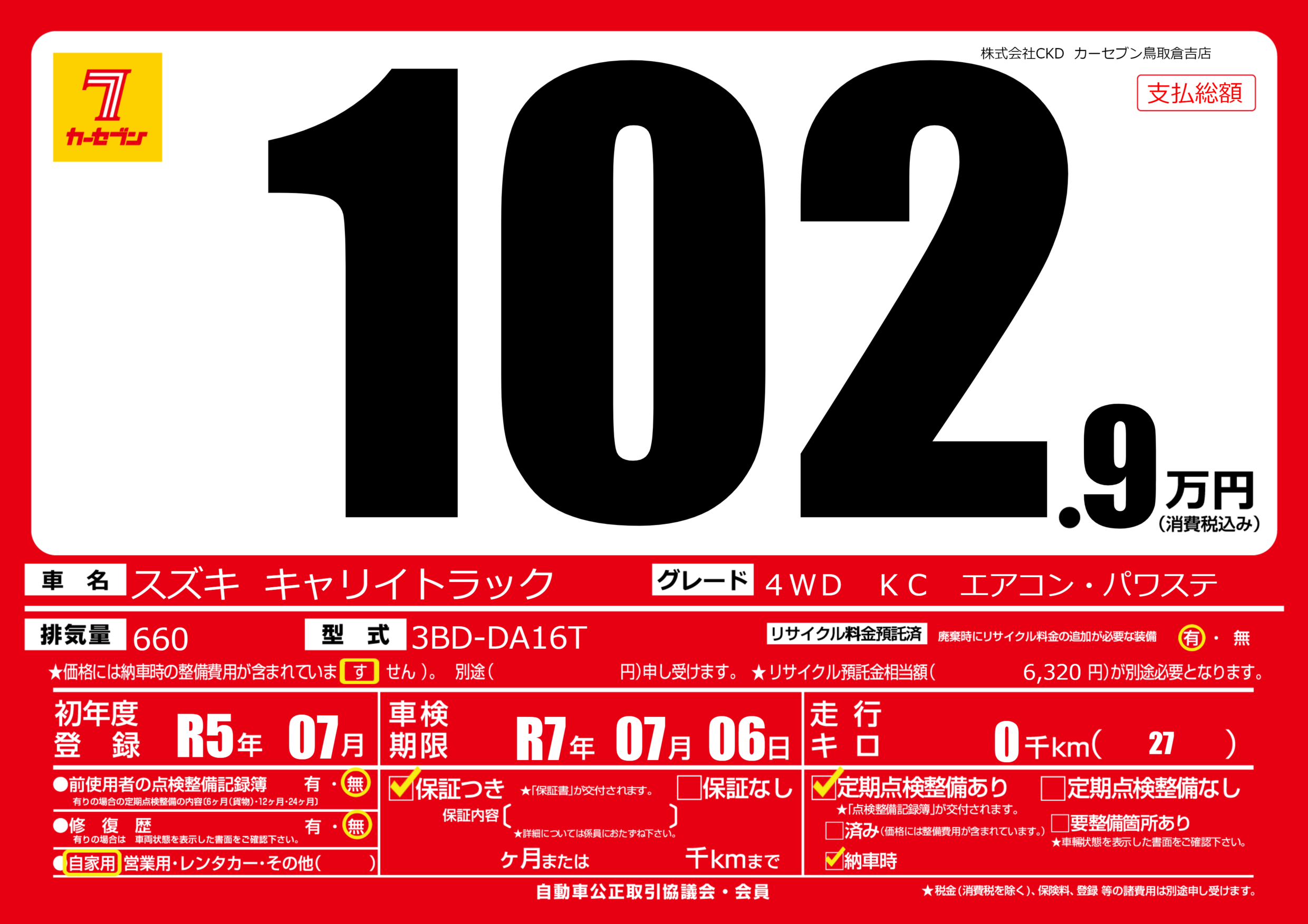 | 走行キロ | - | 初年度登録 | R5年07月 |