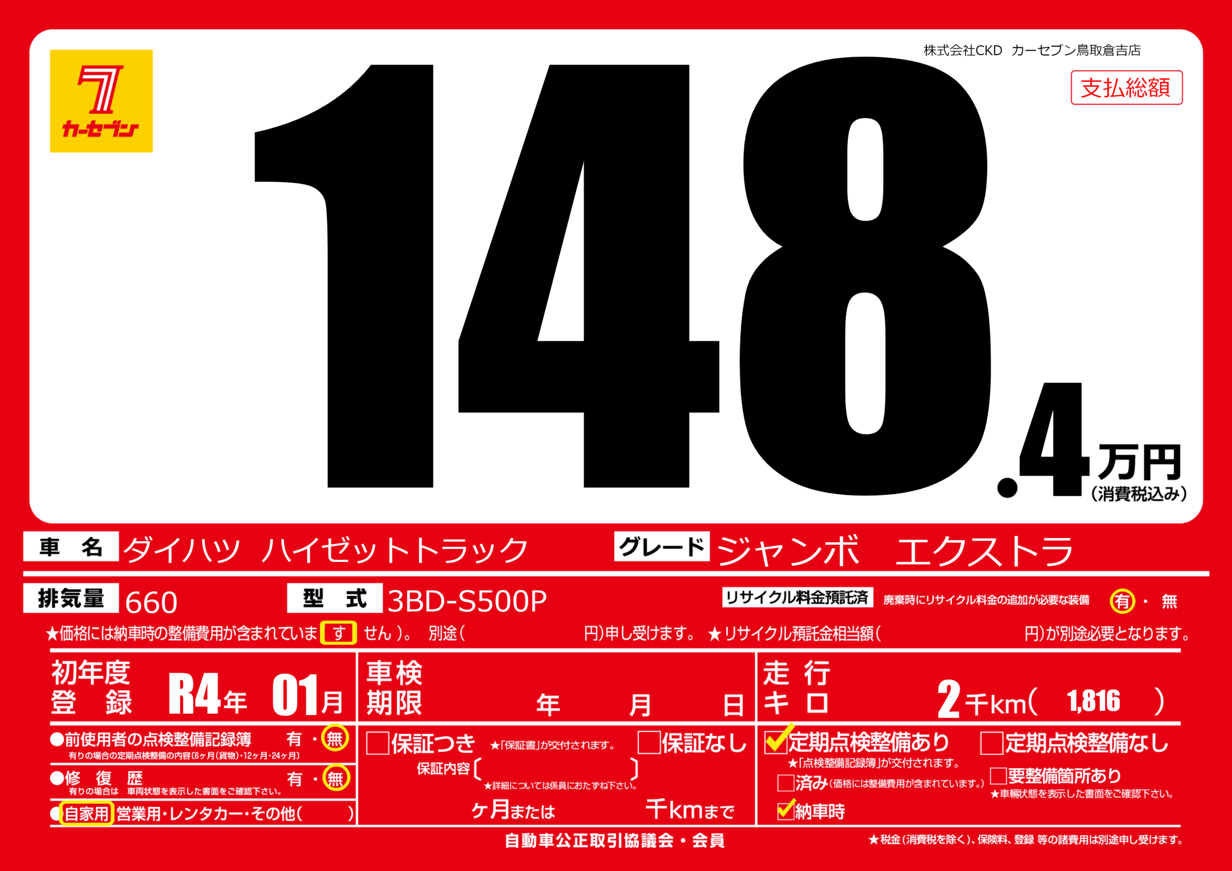 | 走行キロ | 0.2万km | 初年度登録 | R4年01月 |