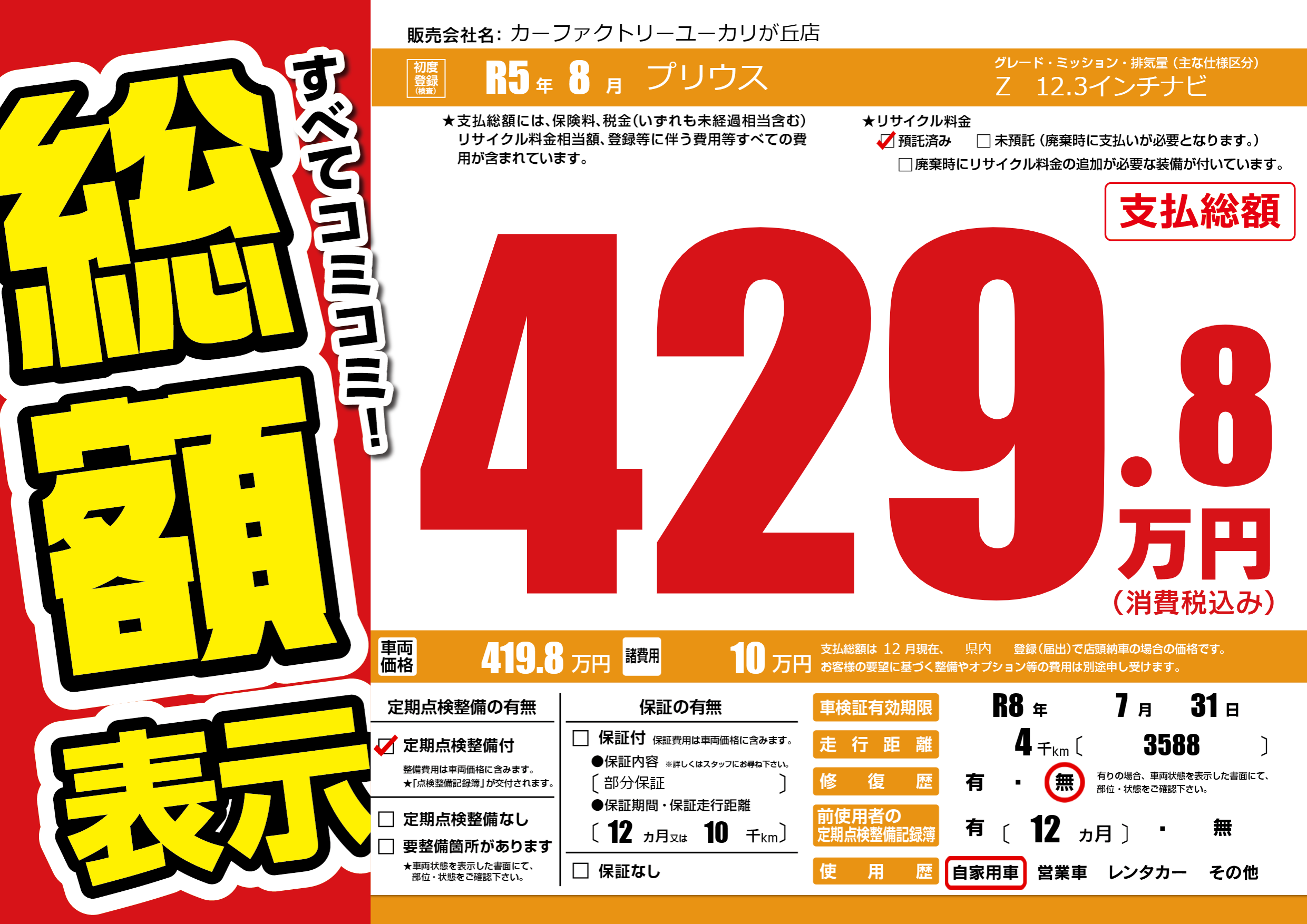 | 走行キロ | 0.4万km | 初年度登録 | R5年8月 |
