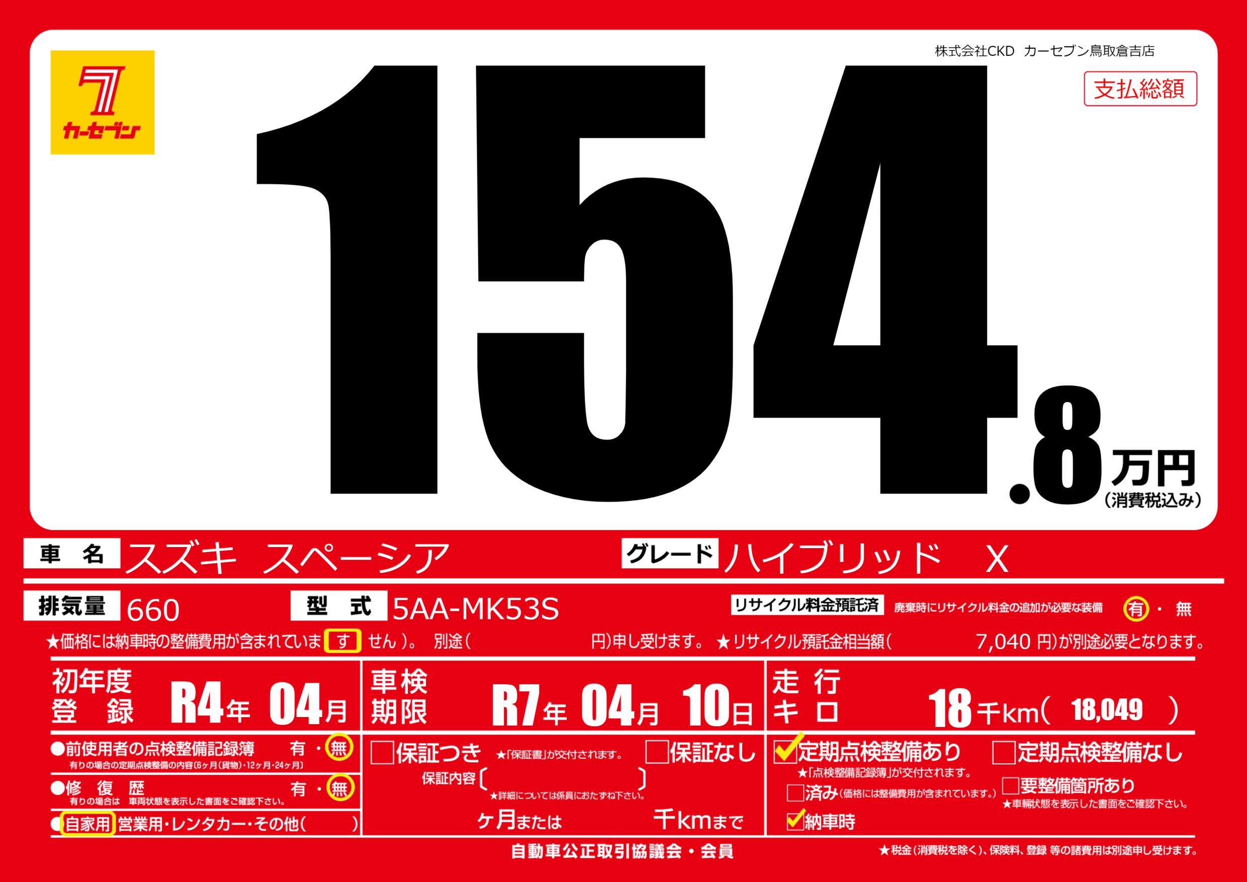| 走行キロ | 1.8万km | 初年度登録 | R4年04月 |