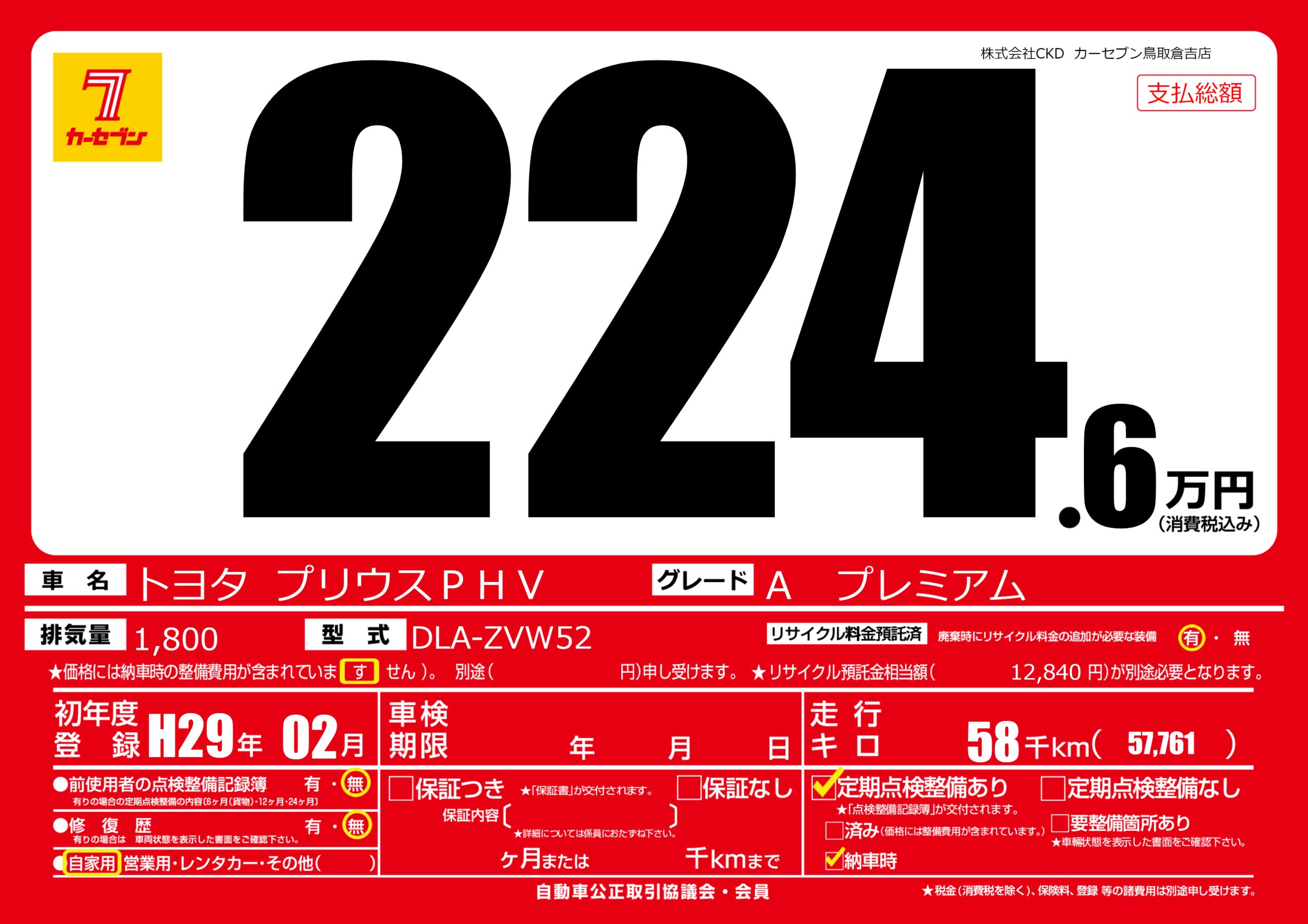 | 車名 | トヨタ プリウスPHV | グレード ミッション 排気量 |
