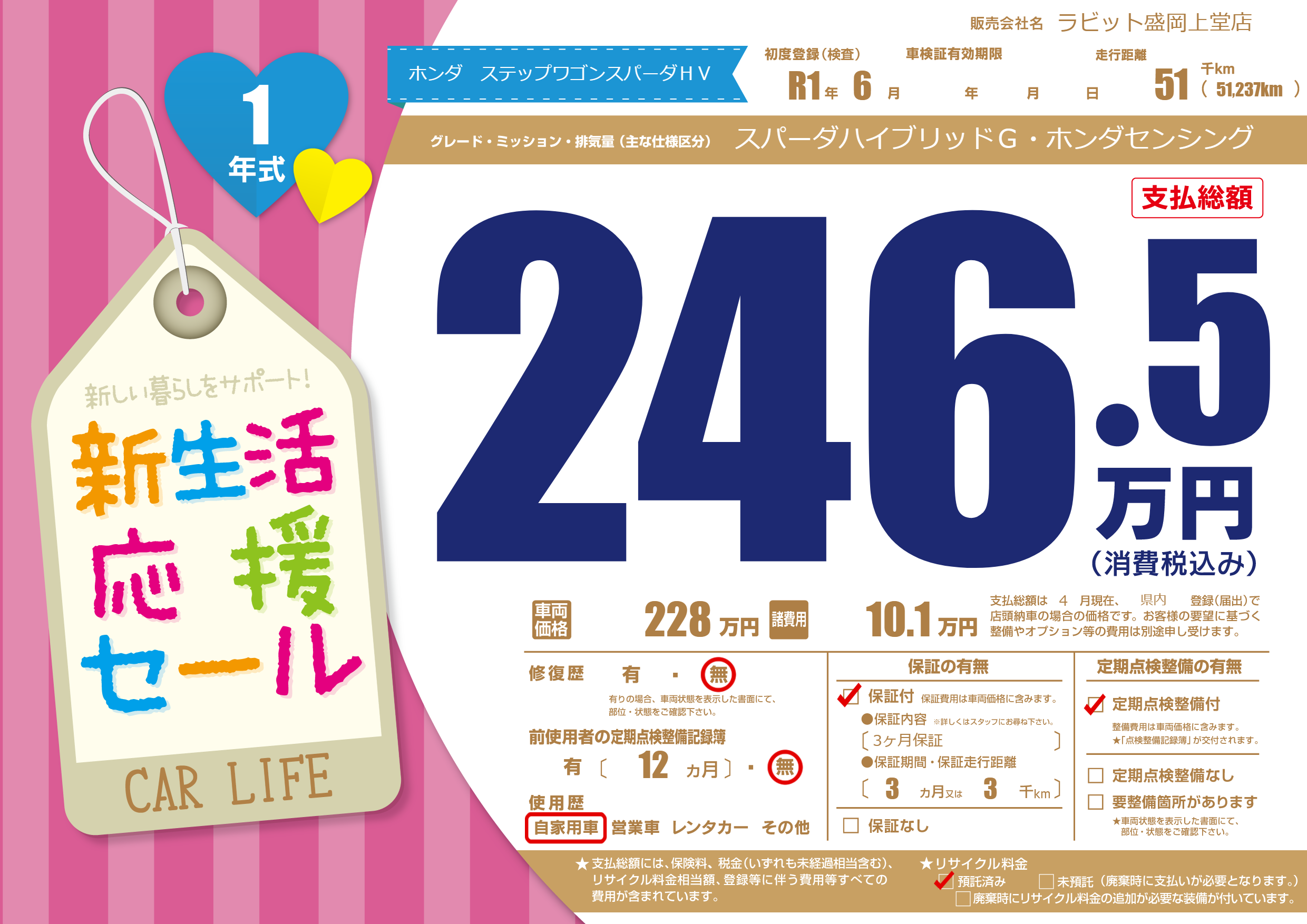 | 走行キロ | 5.1万km | 初年度登録 | R1年6月 |