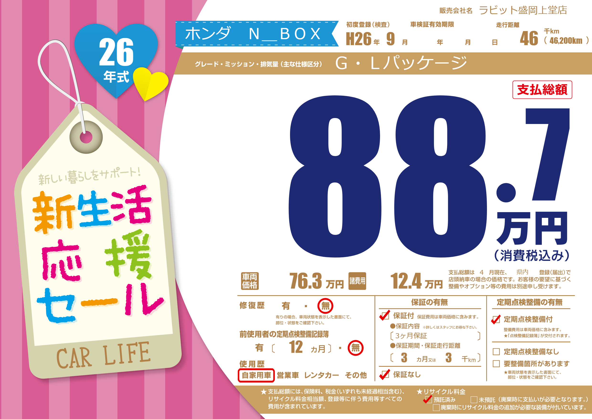 | 走行キロ | 4.6万km | 初年度登録 | H26年9月 |