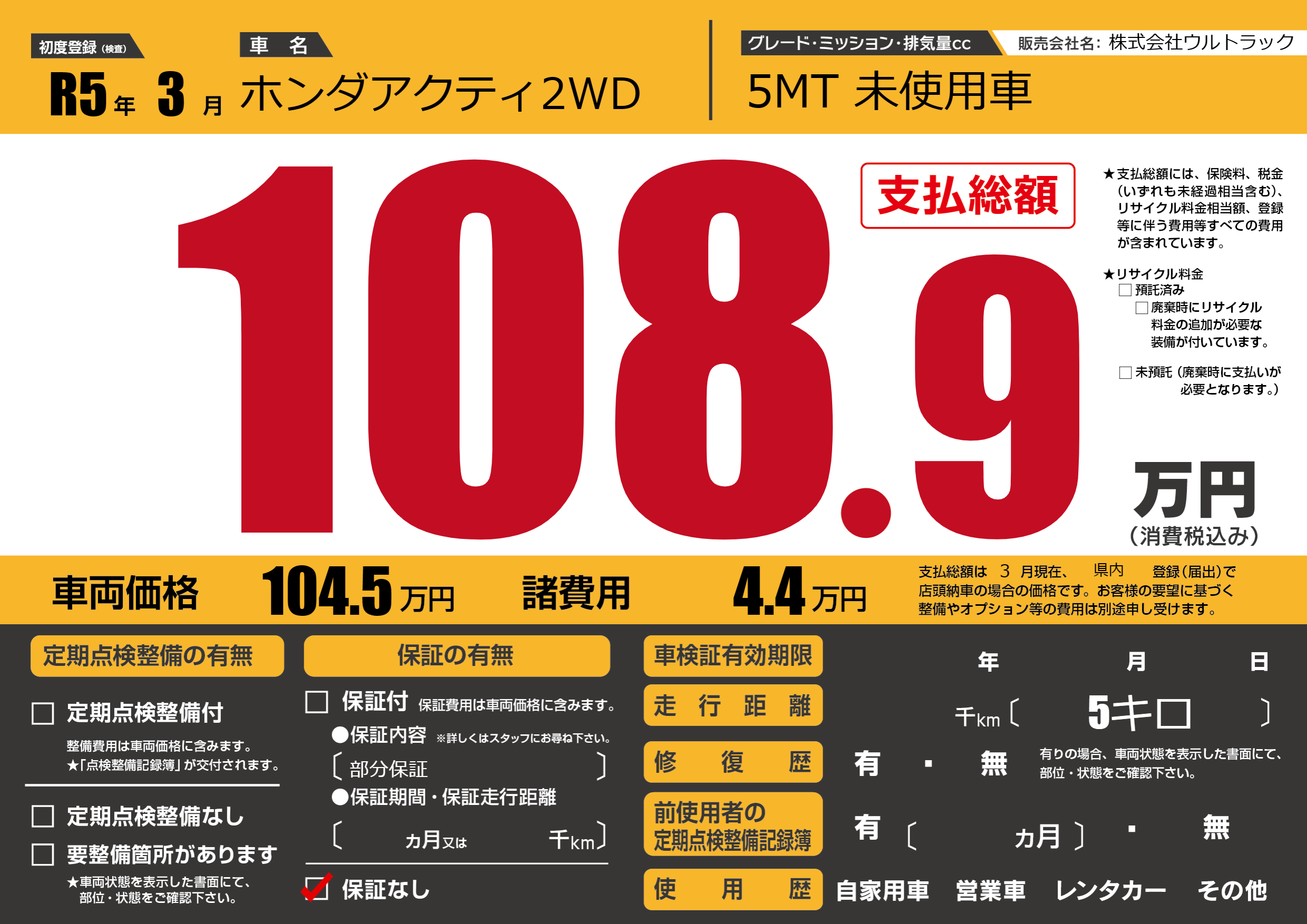 | 車名 | ホンダアクティ2WD | グレード ミッション 排気量 |