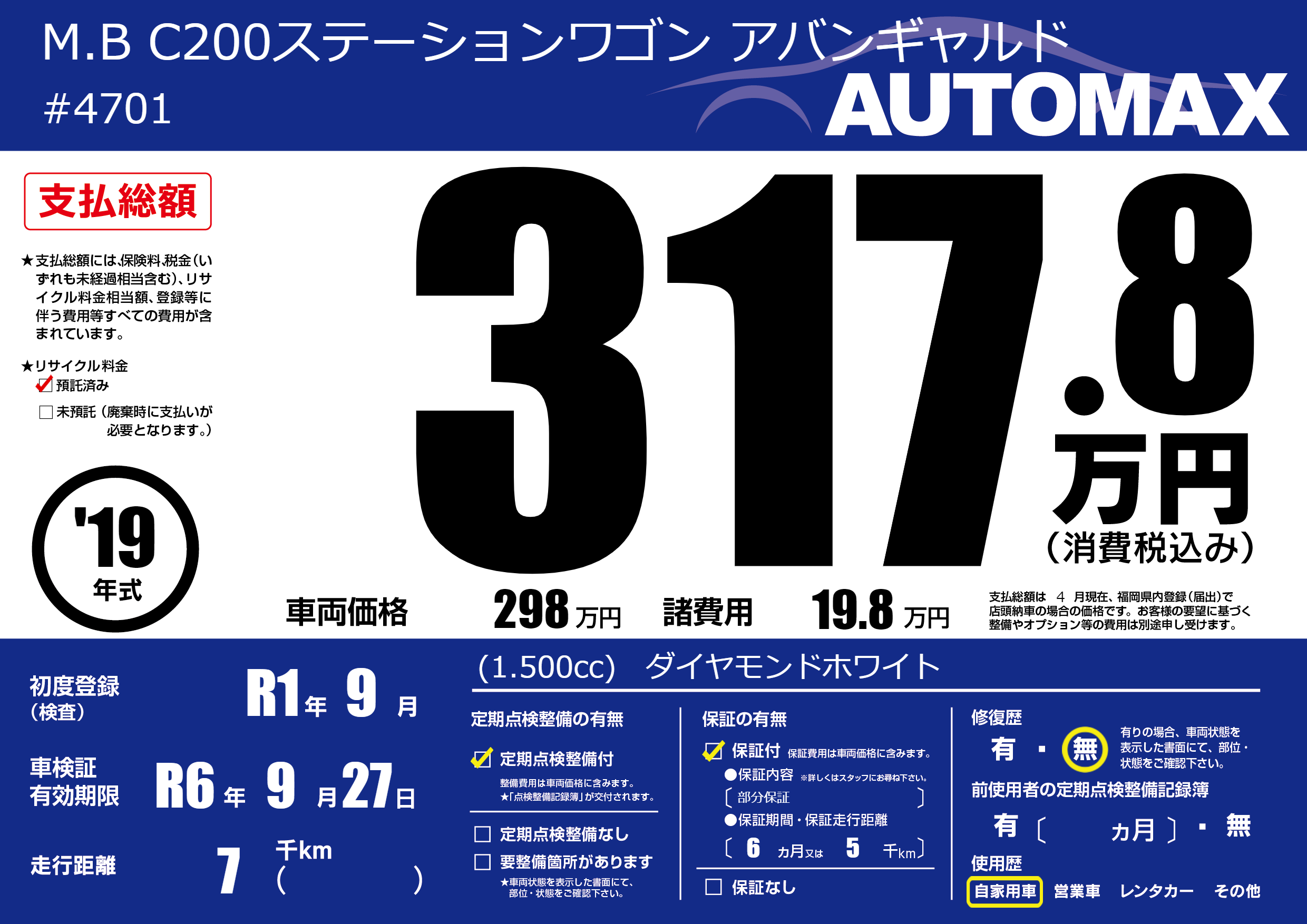 | 車名 | M.B C200ステーションワゴン アバンギャルド | グレード ミッション 排気量 |
