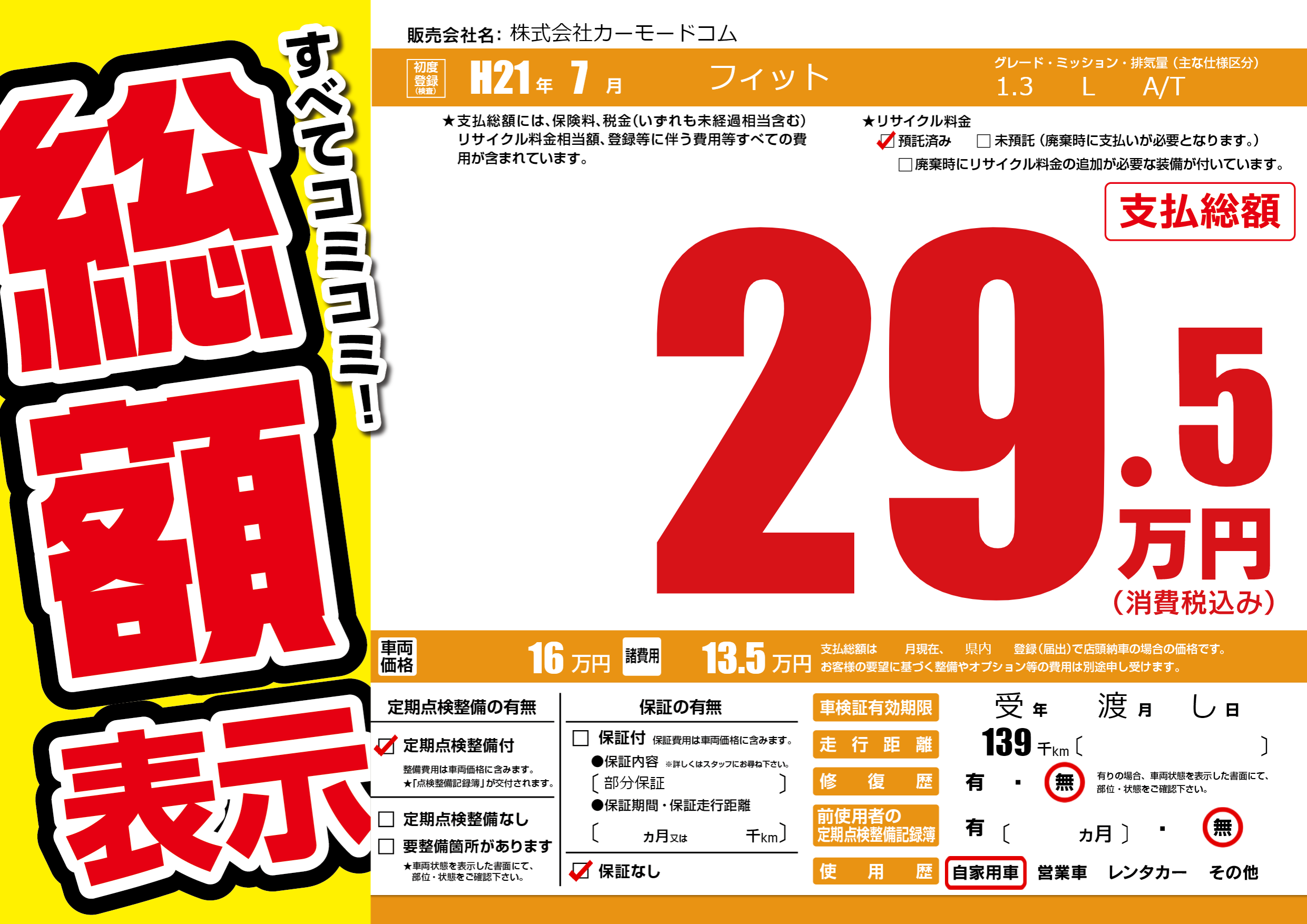 | 走行キロ | 13.9万km | 初年度登録 | H21年7月 |