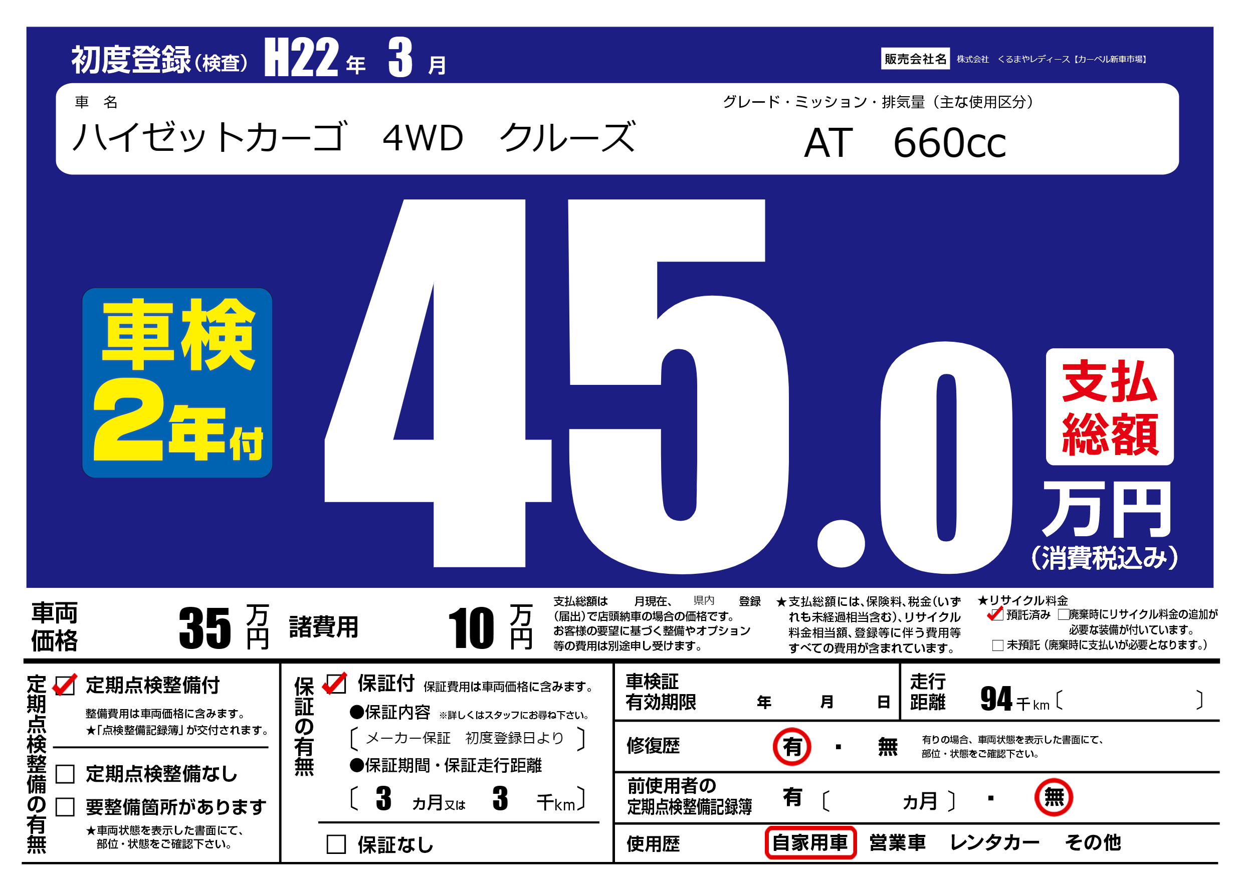 | 走行キロ | 9.4万km | 初年度登録 | H22年3月 |