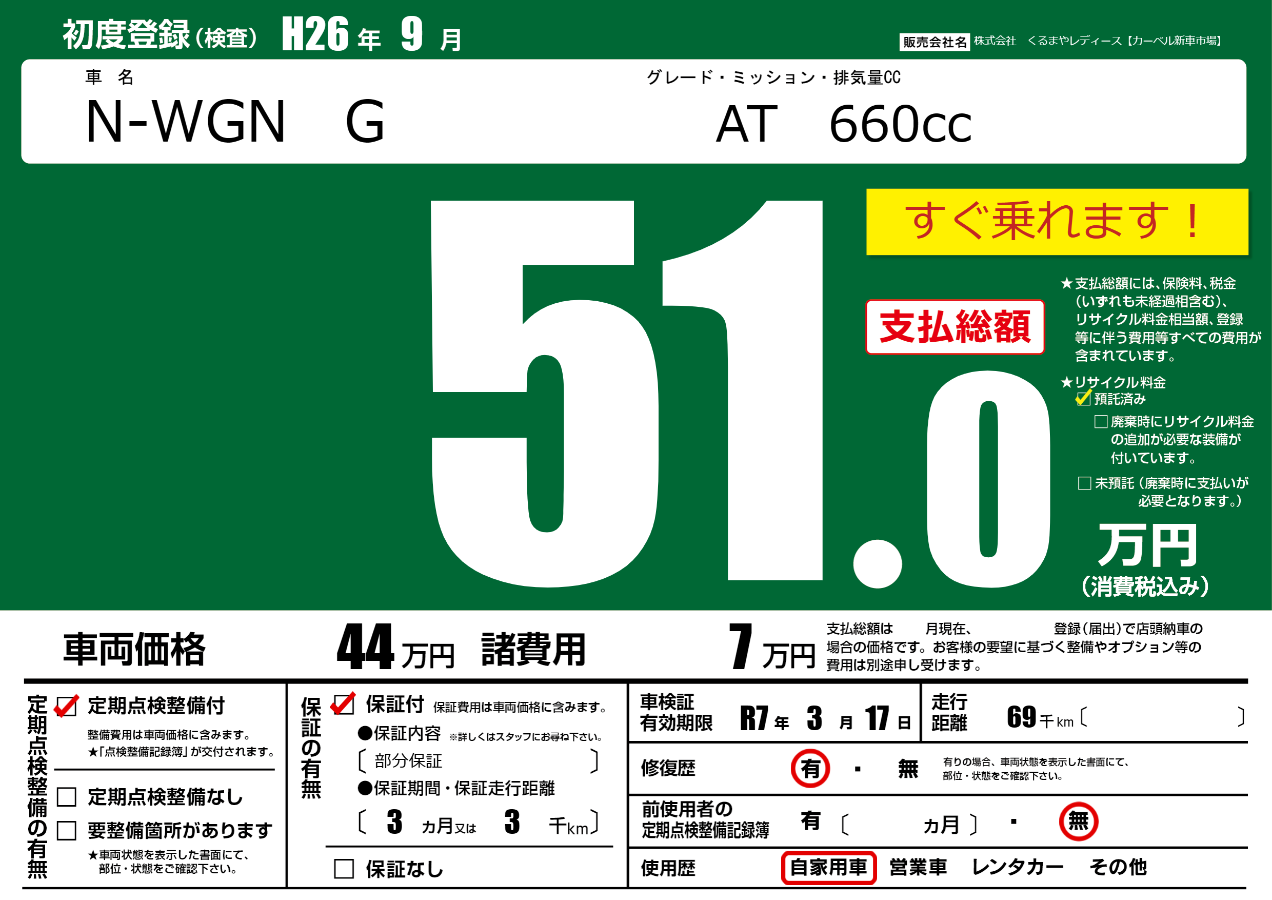| 車名 | N-WGN G | グレード ミッション 排気量 |
