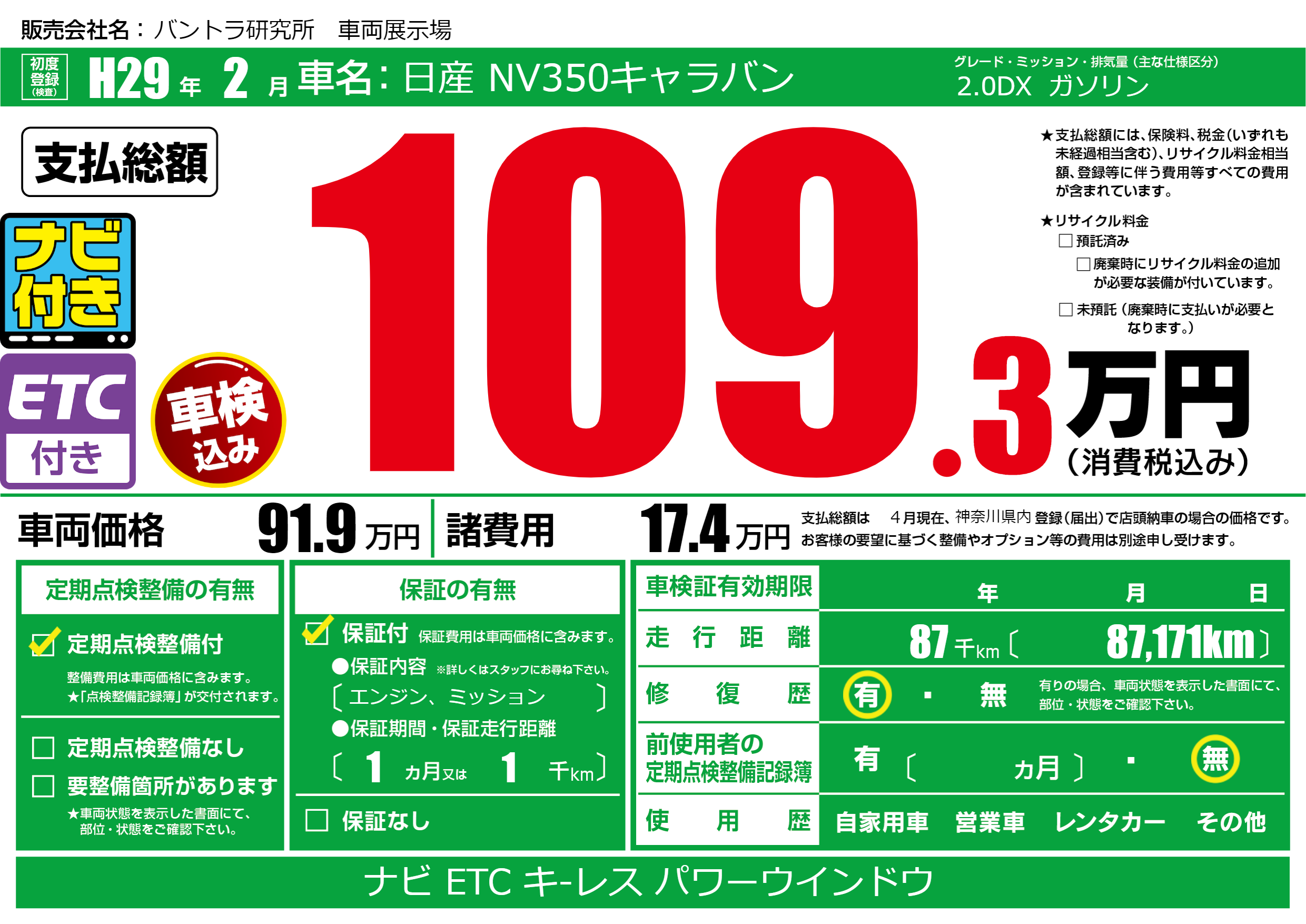 | 車名 | 日産 NV350キャラバン | グレード ミッション 排気量 |