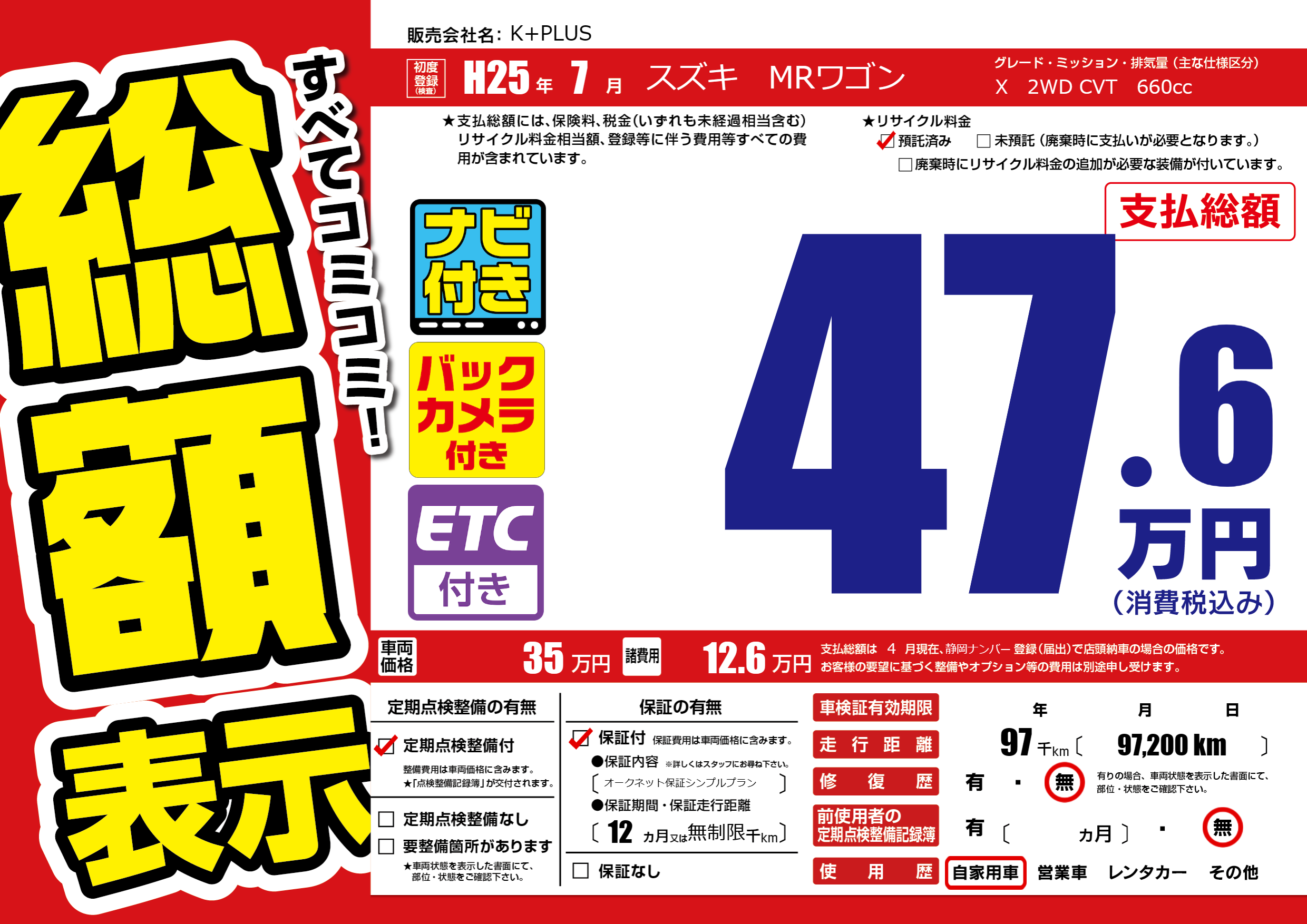 | 車名 | スズキ MRワゴン | グレード ミッション 排気量 |