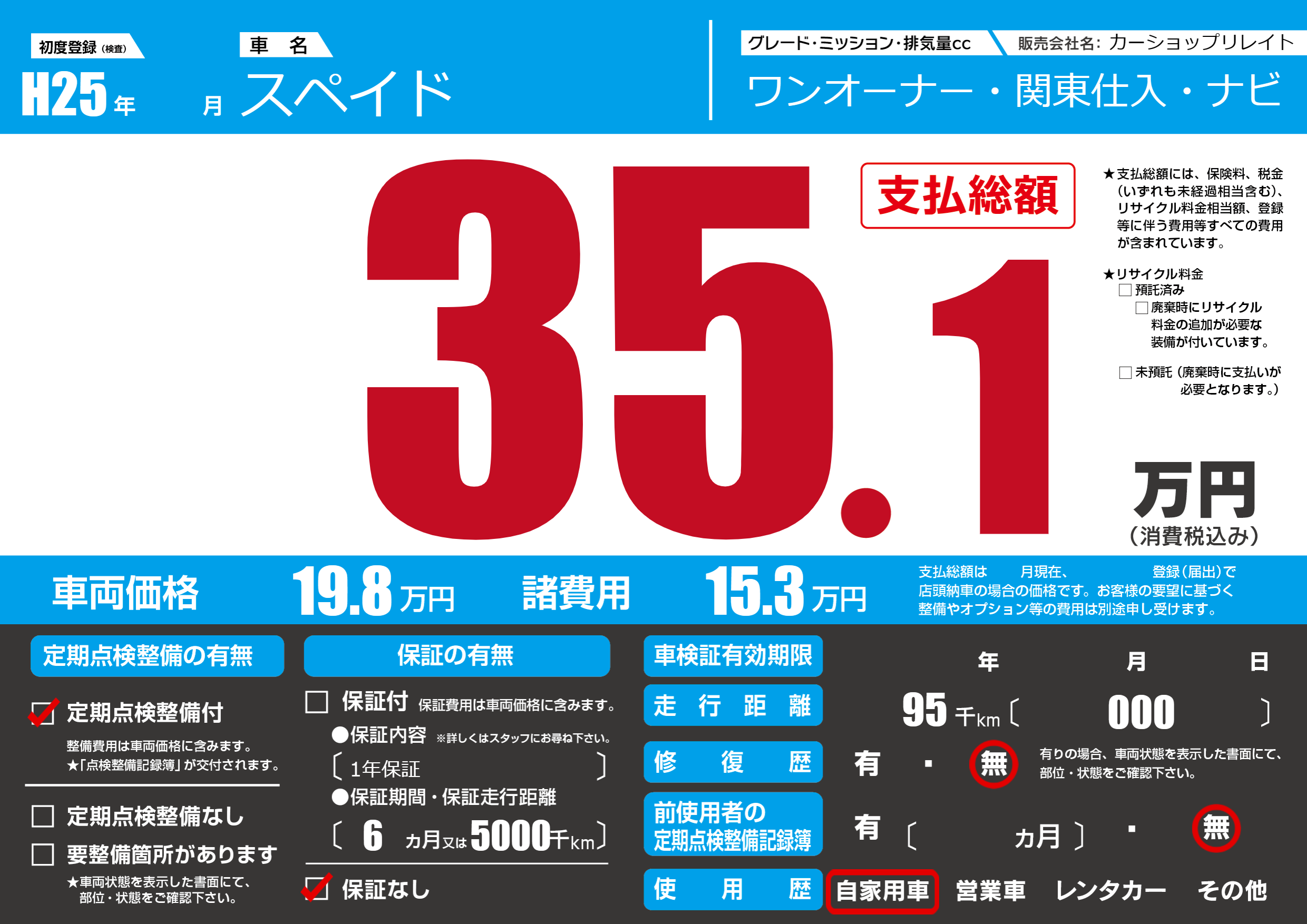 | 車名 | スペイド | グレード ミッション 排気量 |
