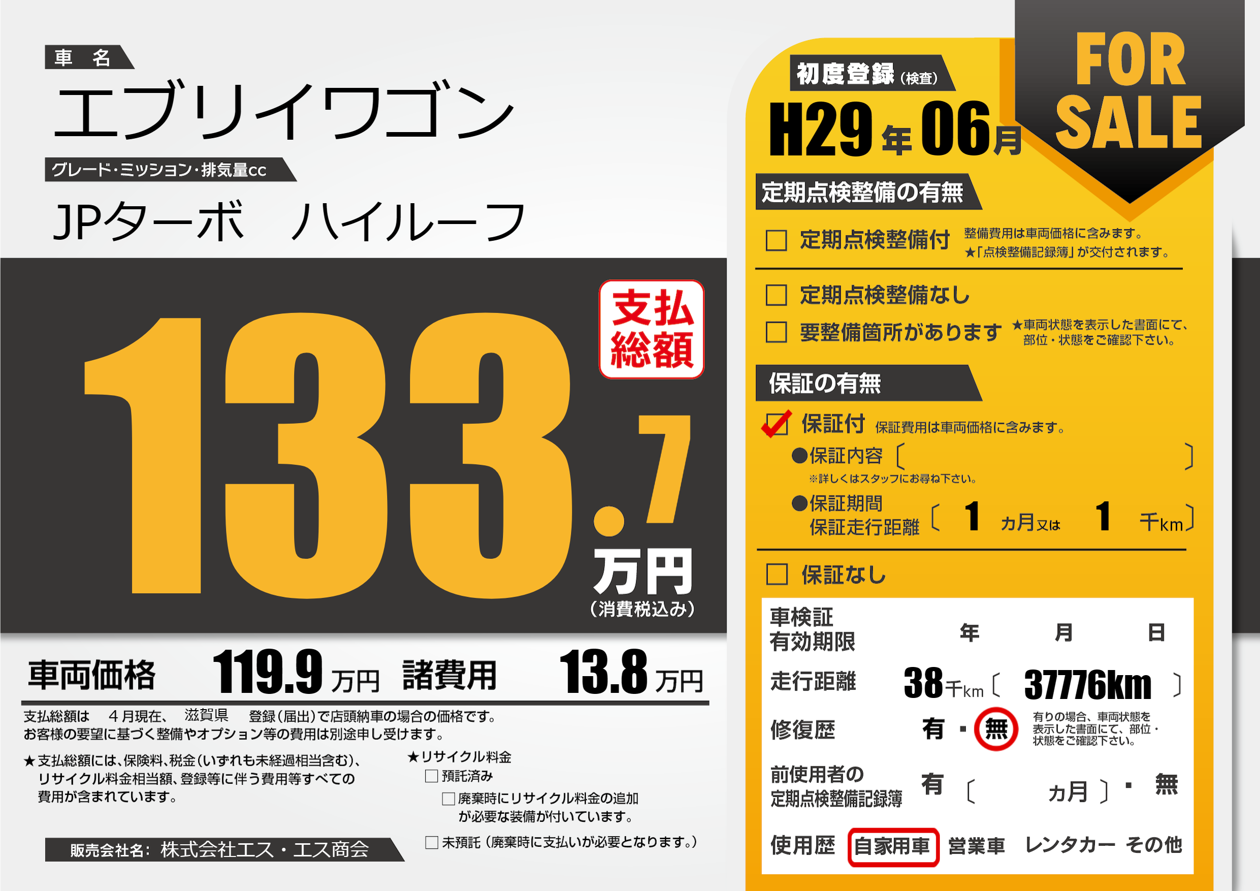 | 走行キロ | 3.8万km | 初年度登録 | H29年06月 |