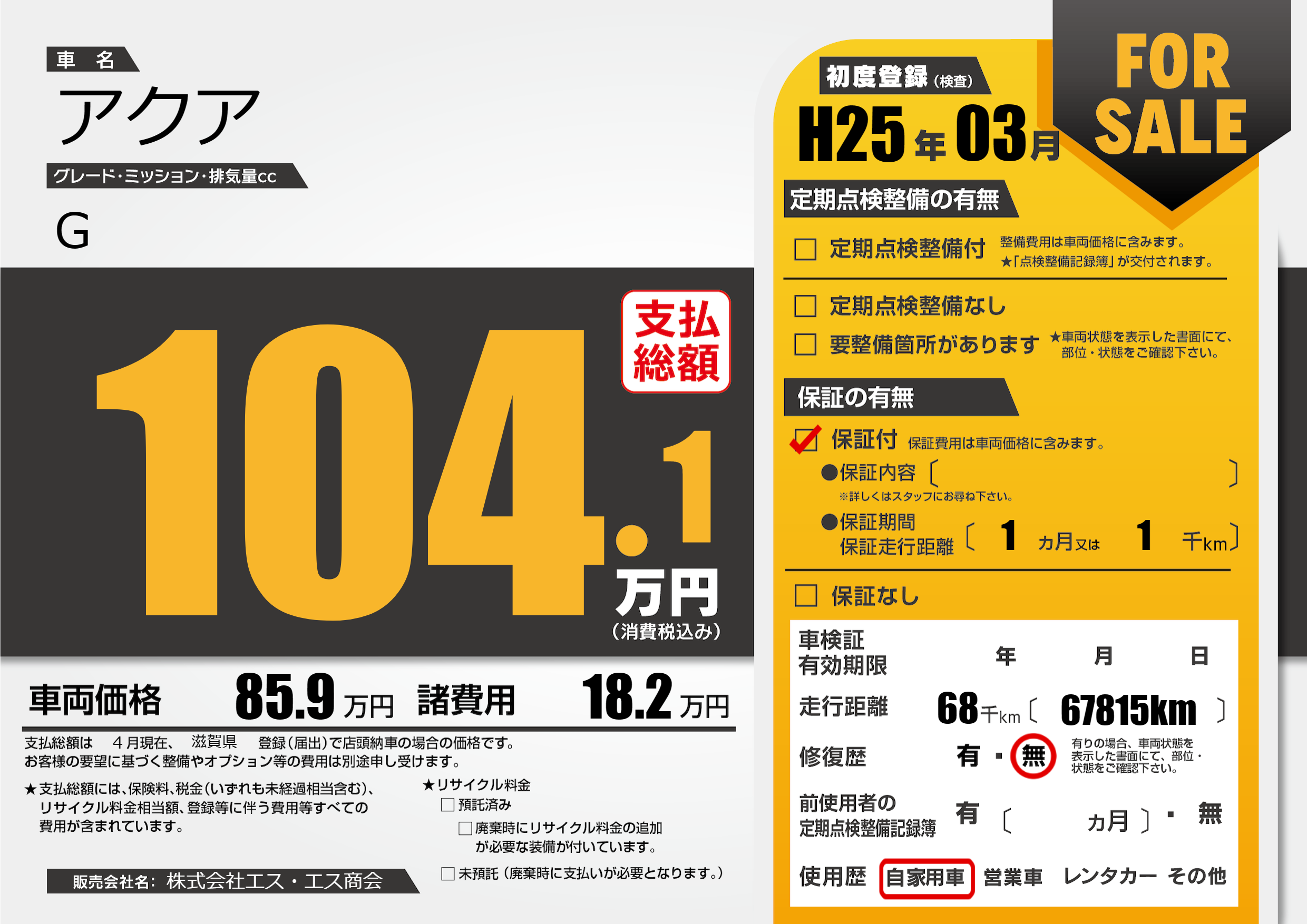 | 走行キロ | 6.8万km | 初年度登録 | H25年03月 |