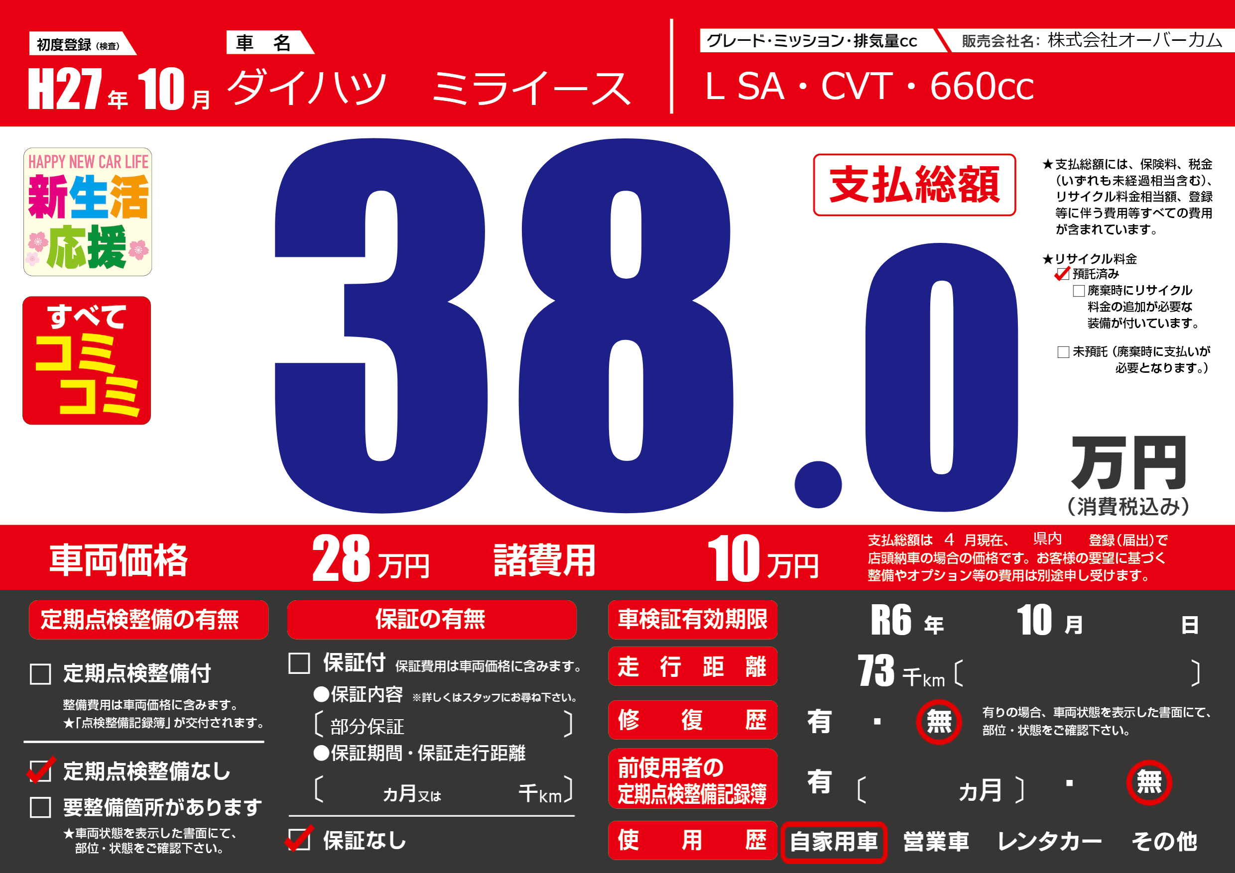 保証なし 保証内容(部分保証) ---ヶ月または()千kmまで |