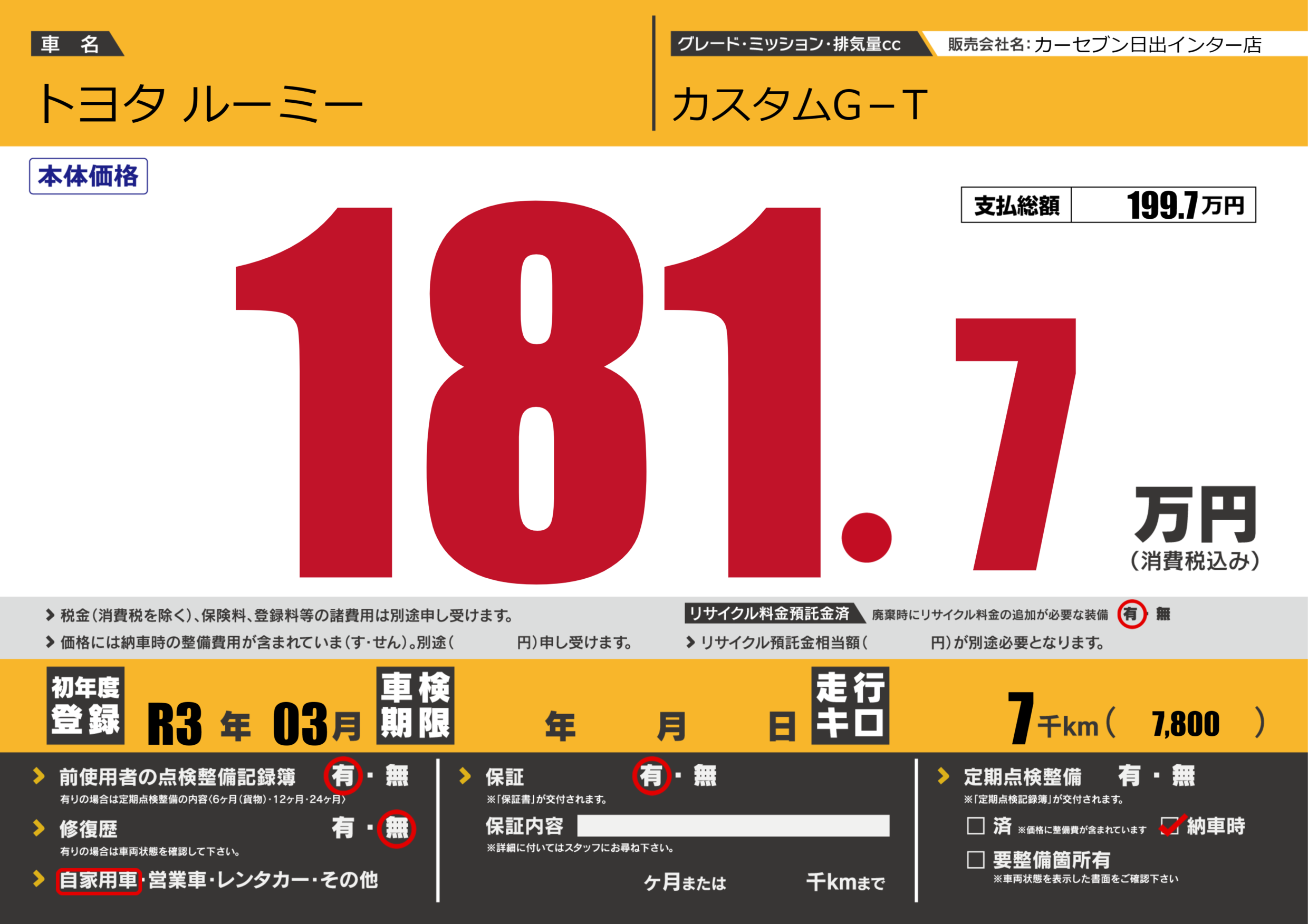 | 車名 | トヨタ ルーミー | グレード ミッション 排気量 |