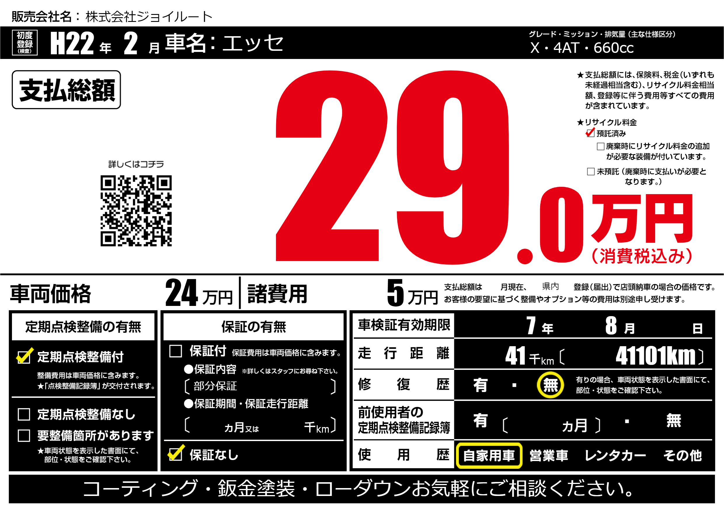 | 走行キロ | 4.1万km | 初年度登録 | H22年2月 |