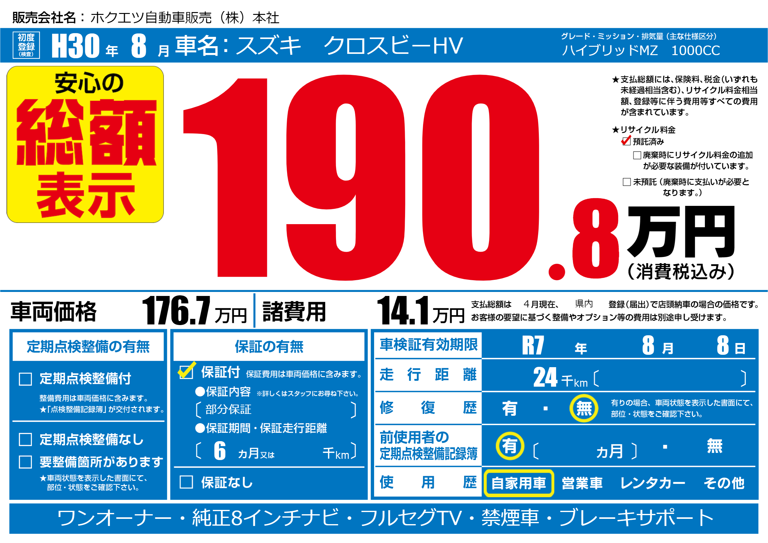 | 車名 | スズキ クロスビーHV | グレード ミッション 排気量 |