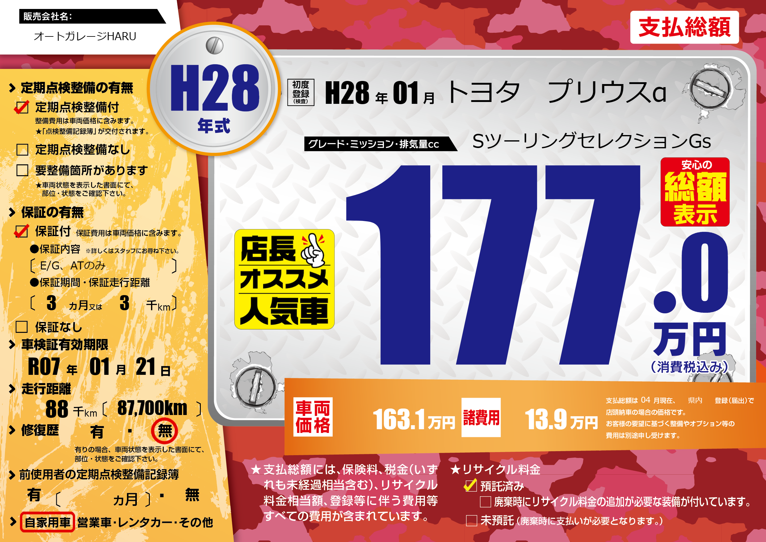 | 車名 | トヨタ プリウスα | グレード ミッション 排気量 |